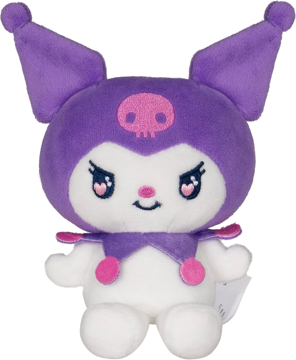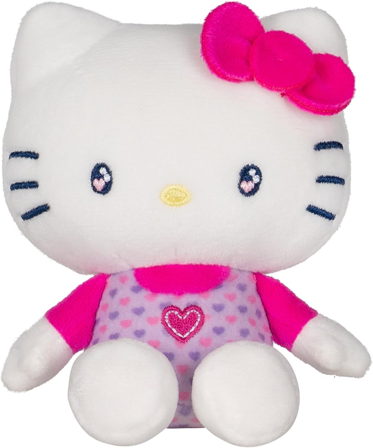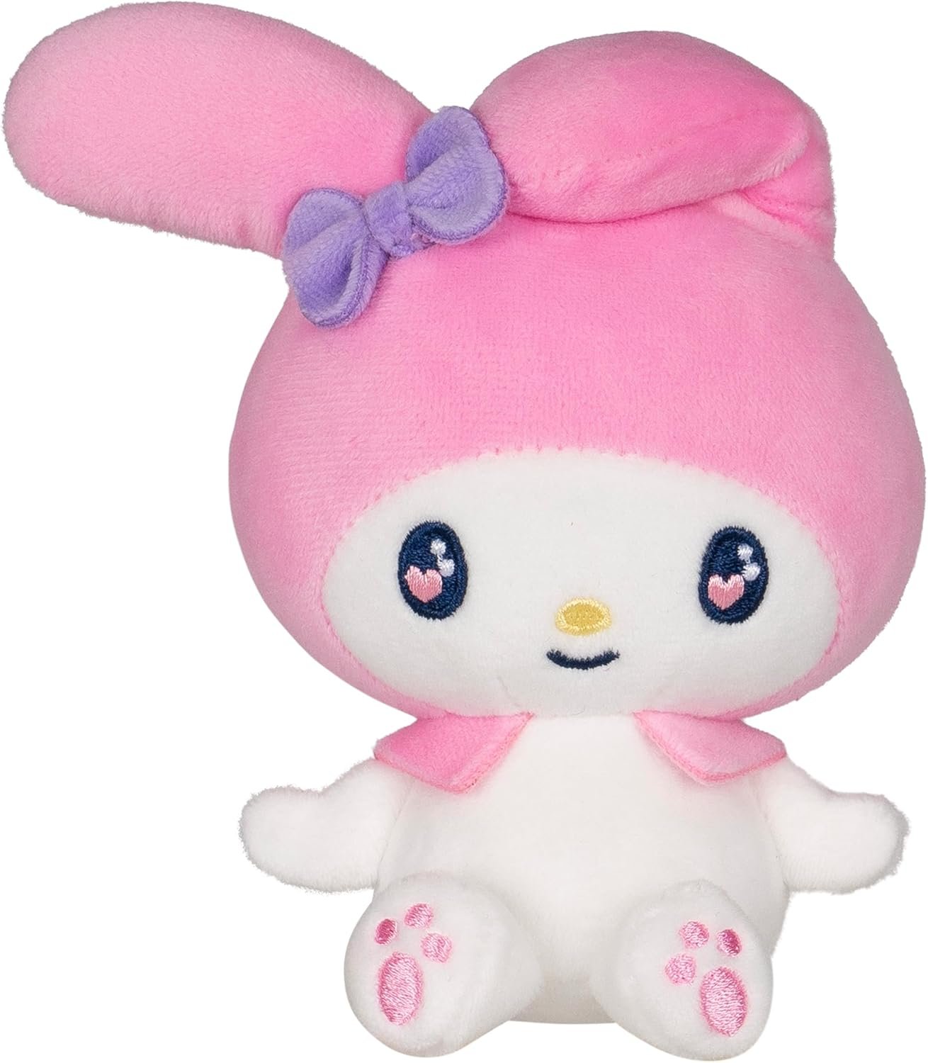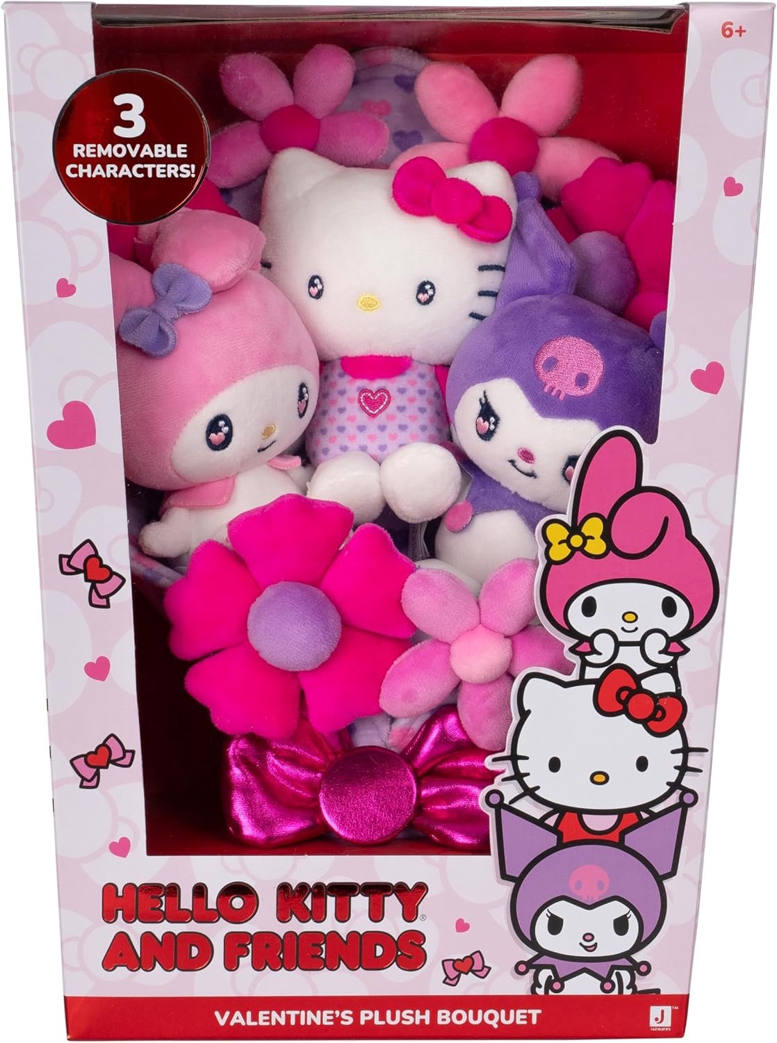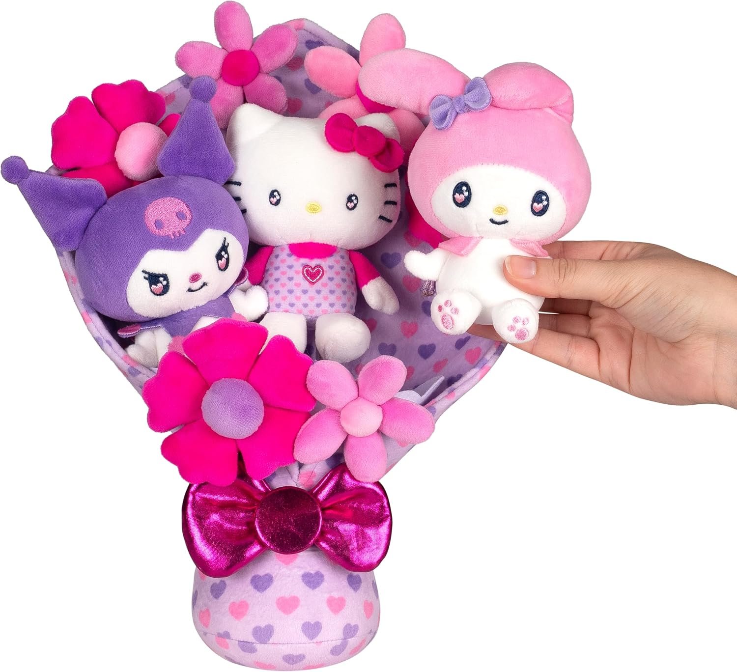 FLORAL ARRANGEMENT: A 12-inch plush bouquet with Hello Kitty, My Melody, and Kuromi plush with heart, love eyes, and six soft flowers in hues of purple and pink; nine plush total