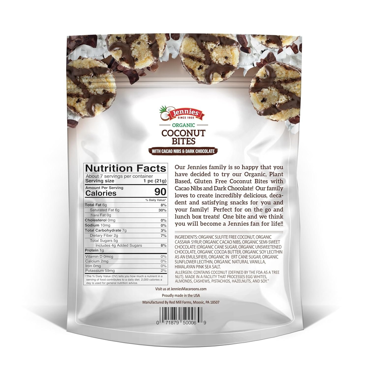 Jennies Organic Coconut Bites with Cacao Nibs and Dark Chocolate, 5.25oz | Gluten Free | Peanut Free | Dairy Free | Non GMO