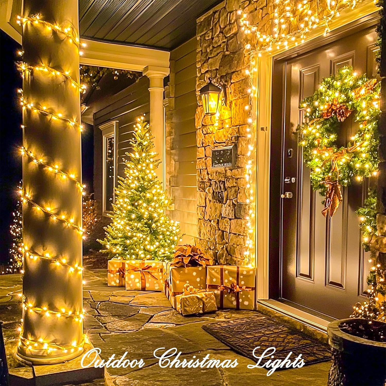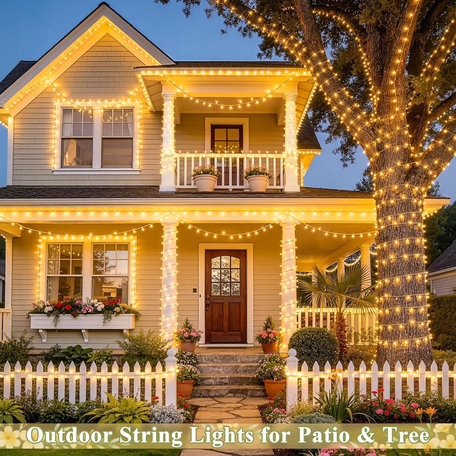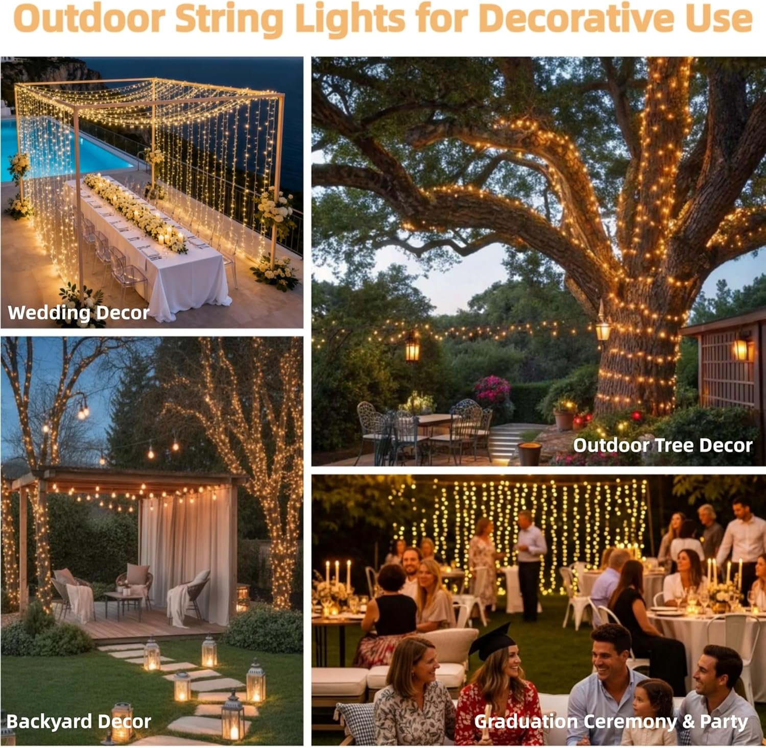 【LED Christmas Lights Outdoor for Decor】 Wrap them around garlands, railings, gates, Christmas trees. After the Christmas, keep them up year-round in your garden, porch, patio, or balcony, transforming every corner. With a 10-foot lead wire, you can plug the twinkle fairy string lights plug in where you need them. On the gentle night, the outdoor string lights for outside illuminated the courtyard and garden, casting a glow that intertwined with the warm string lights from within the house.