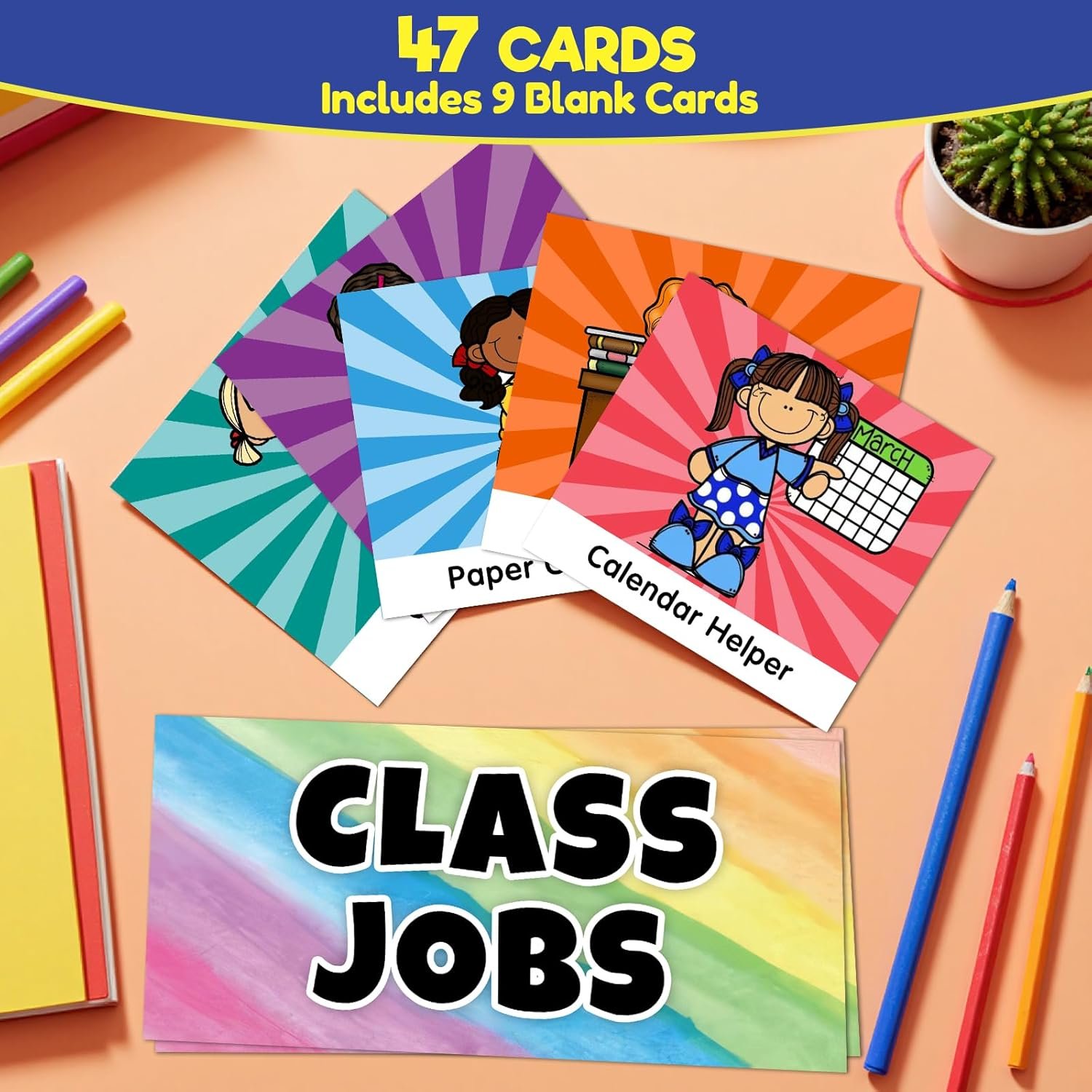 ULTIMATE JOB POCKET CHART WITH 47 COLORFUL CARDS – The classroom jobs bulletin board set has 2 banner card, 36 task cards, 9 erasable blank cards and 40 clips. Plenty of cards make your classroom life easier! (The size of the job cards is 3.93*3.54 inches)