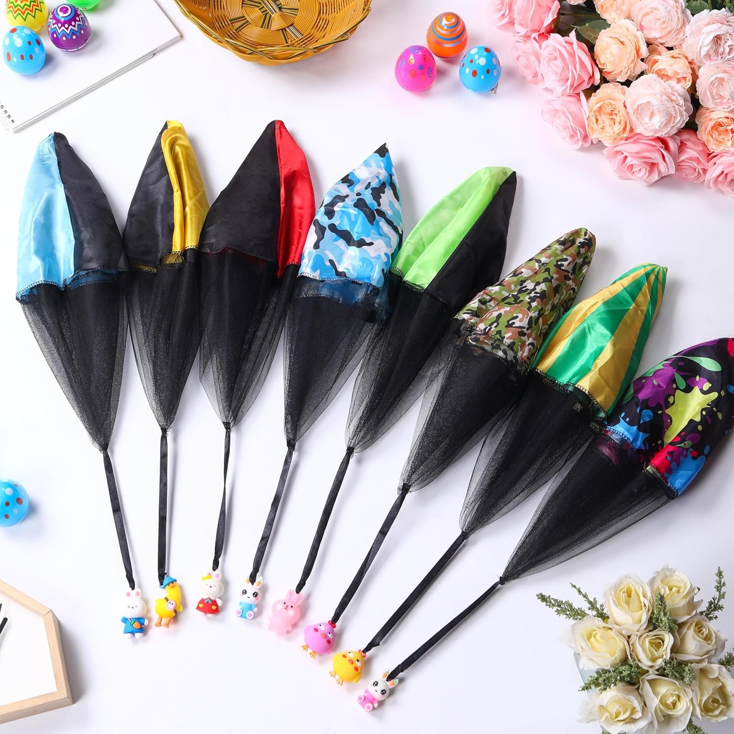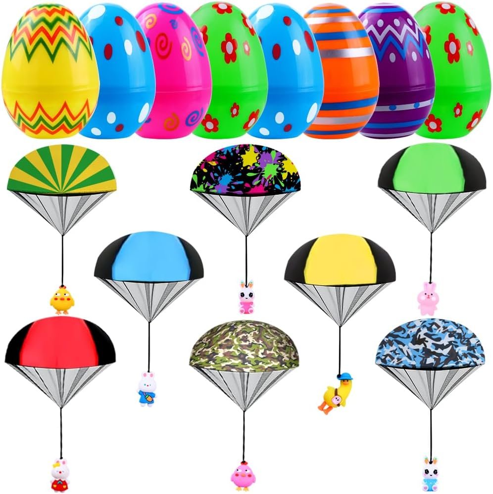 Easter Parachute Toys: Each set of parachute games includes 8 Easter eggs as well as 8 parachute toys. Each parachute has a different cute Easter animal image underneath such as bunnies, chicks, ducks. These toys, which are designed to be thrown by hand, feature a rich variety of colors.