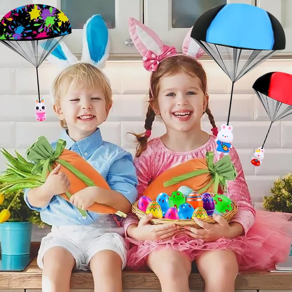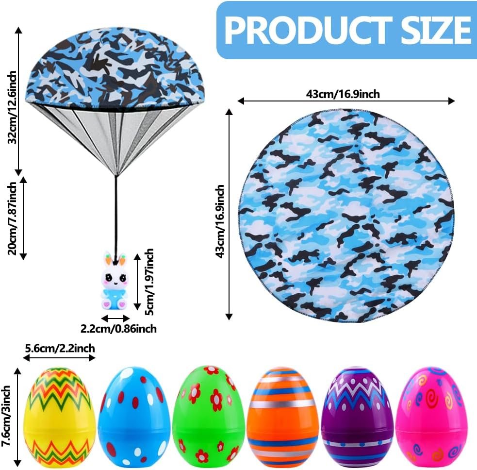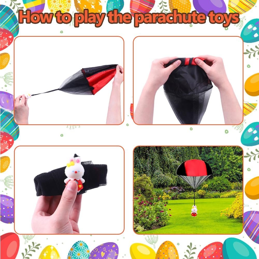 Easy To Play:Just fold, then throw and catch the parachute toys. Try tossing it skyward with all your might. It will gracefully float back down, providing the perfect opportunity for kids to reach out and grab it. Besides indulging in their favorite Easter candy, your children are bound to have a wonderful time with this toy. It adds an extra element of fun to their holiday celebrations.