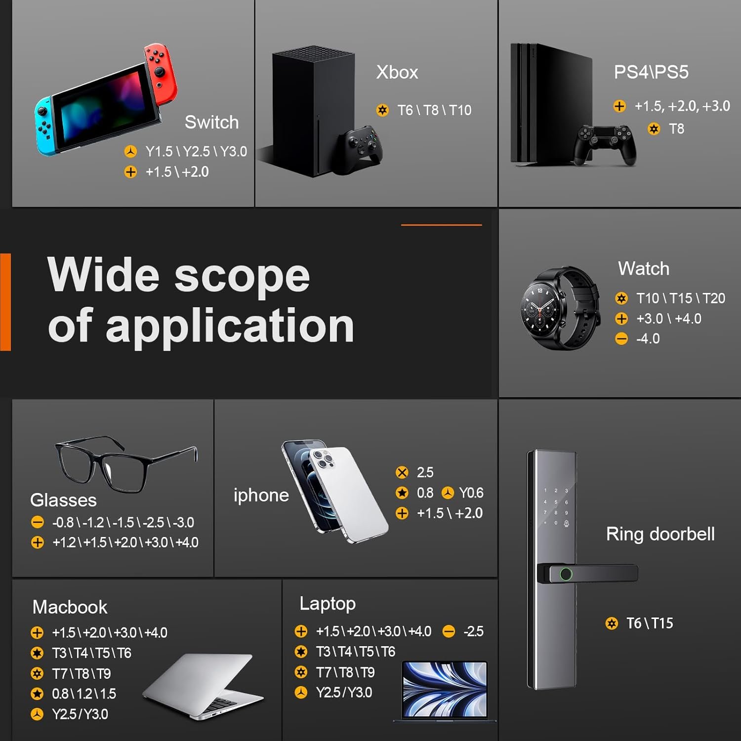 【Wide scope of application】– T8 +1.5/2.0/3.0 are used for PS3/PS4/PS5 controllers and consoles. T6/8/10 are used for Xbox 360/Xbox One/Xbox Series controllers and consoles. Y1.5/2.5/3.0 +1.5/2.0 are used for Switch/NS-Lite/Joy-Con/Wii/Game Boy Advance. T3/8 are used for Fitbit wristband/folding knife. +1.2/1.5/2.0/3.0/4.0 T3/4/5/6/7/8/9 Y2.5/3.0 -2.5 are used for Microsoft/Acer/Dell and other laptops. +1.2/1.5/2.0/3.0/4.0 -0.8/1.2/1.5/2.5/3.0 are used for Desktop Computer/Watch/Glasses/Toy.