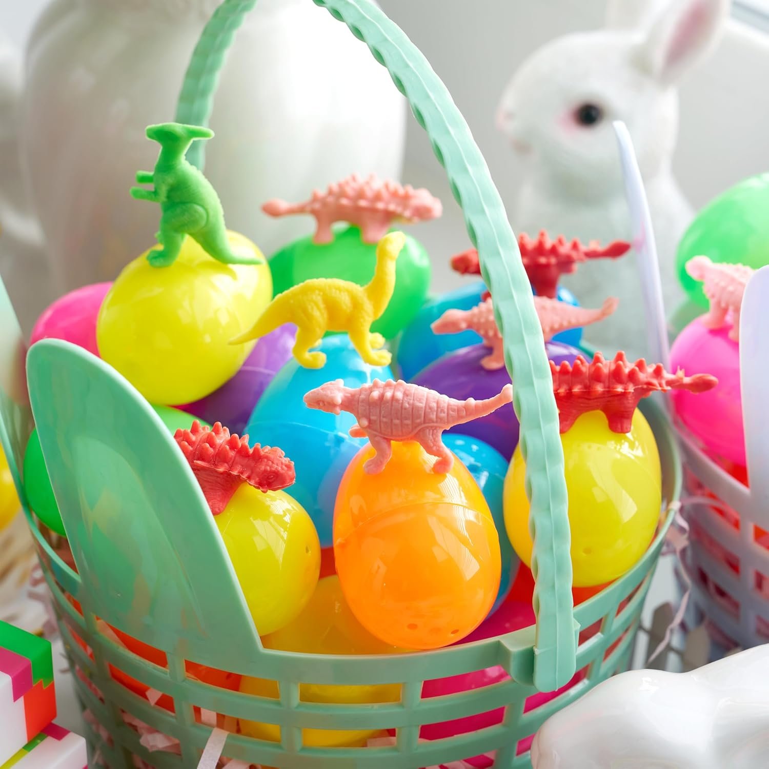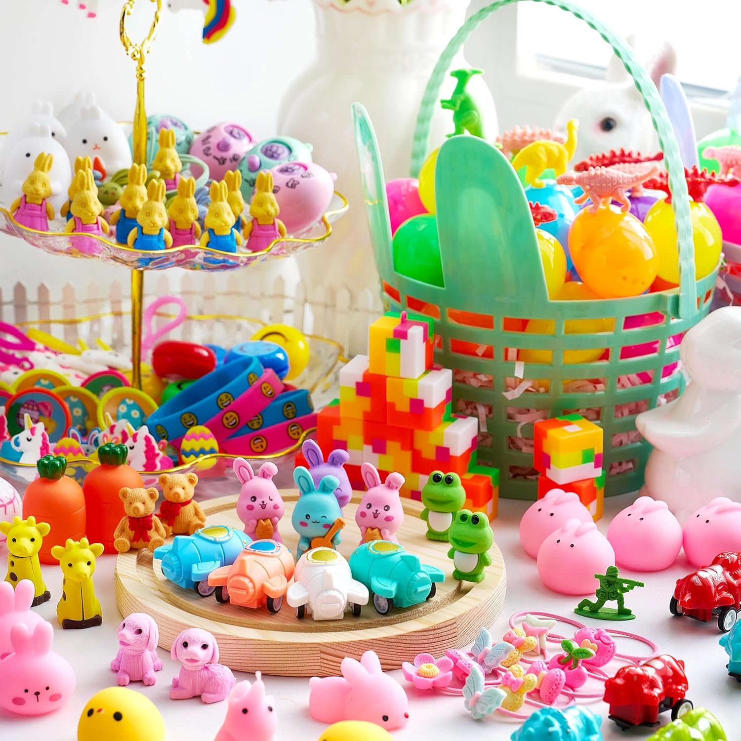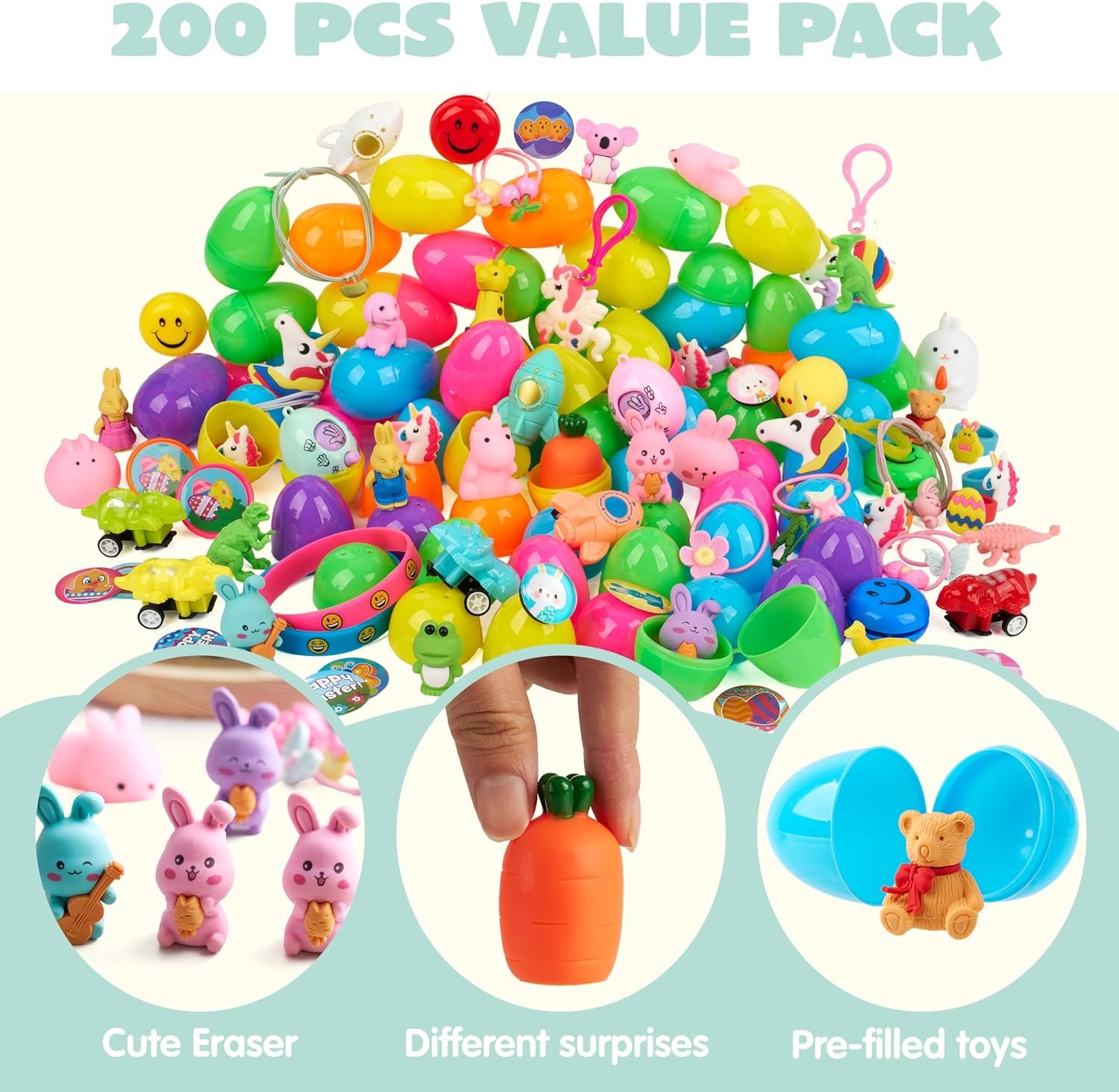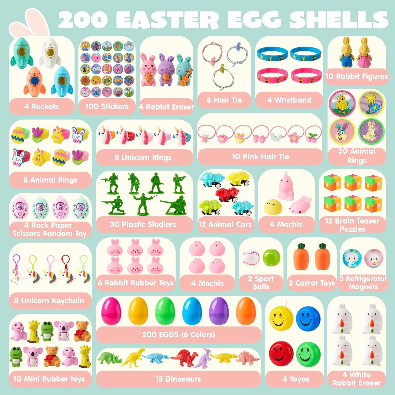 SUPER VALUE PACK. Each egg is prefilled one toy and one easter sticker; Valuable and Durable 200 Pieces Toy Prefilled Premium Easter Eggs includes 200 toys with 27 Unique Types such as Mochi squishy toy, Easter Bracelets, Pull Back cars, Easter plastic big ring, Animal eraser, and Dinosaur, etc.