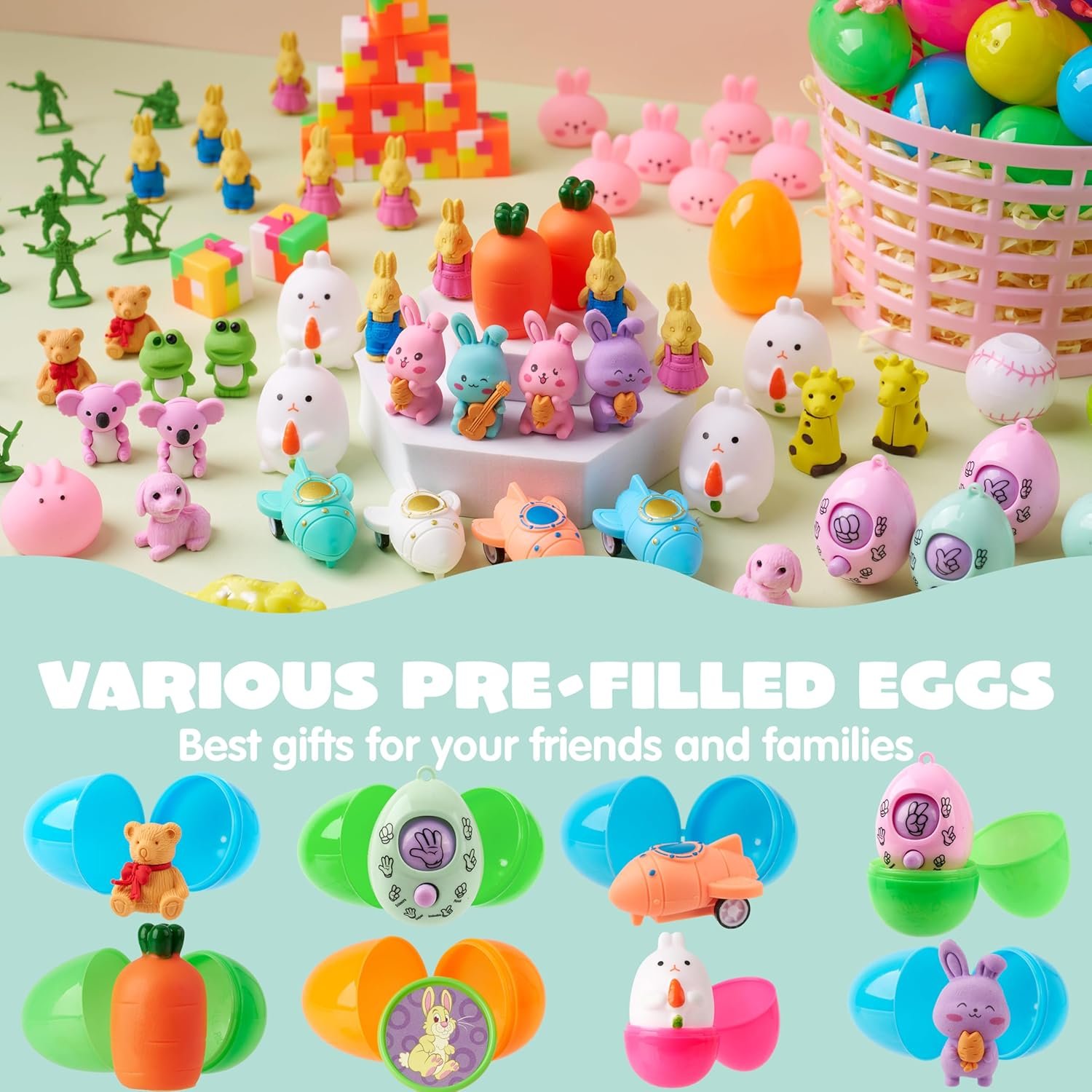 UNIQUE DESIGN. Fill all your eggs with this fun assortment of toys. This novelty assortment is loaded with plenty of toys and treats for everyone! NOT EVERY TOY IS SHOWN IN THE PRODUCT IMAGE. MORE TO DISCOVER IN THE EGGS!