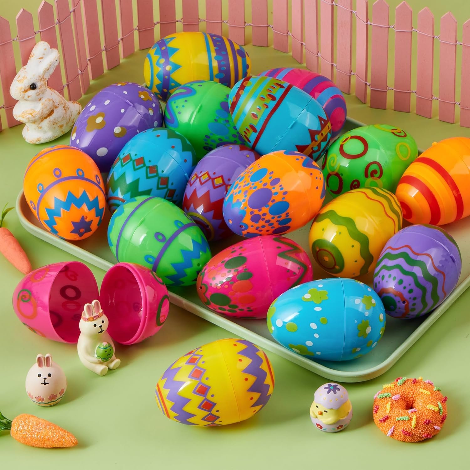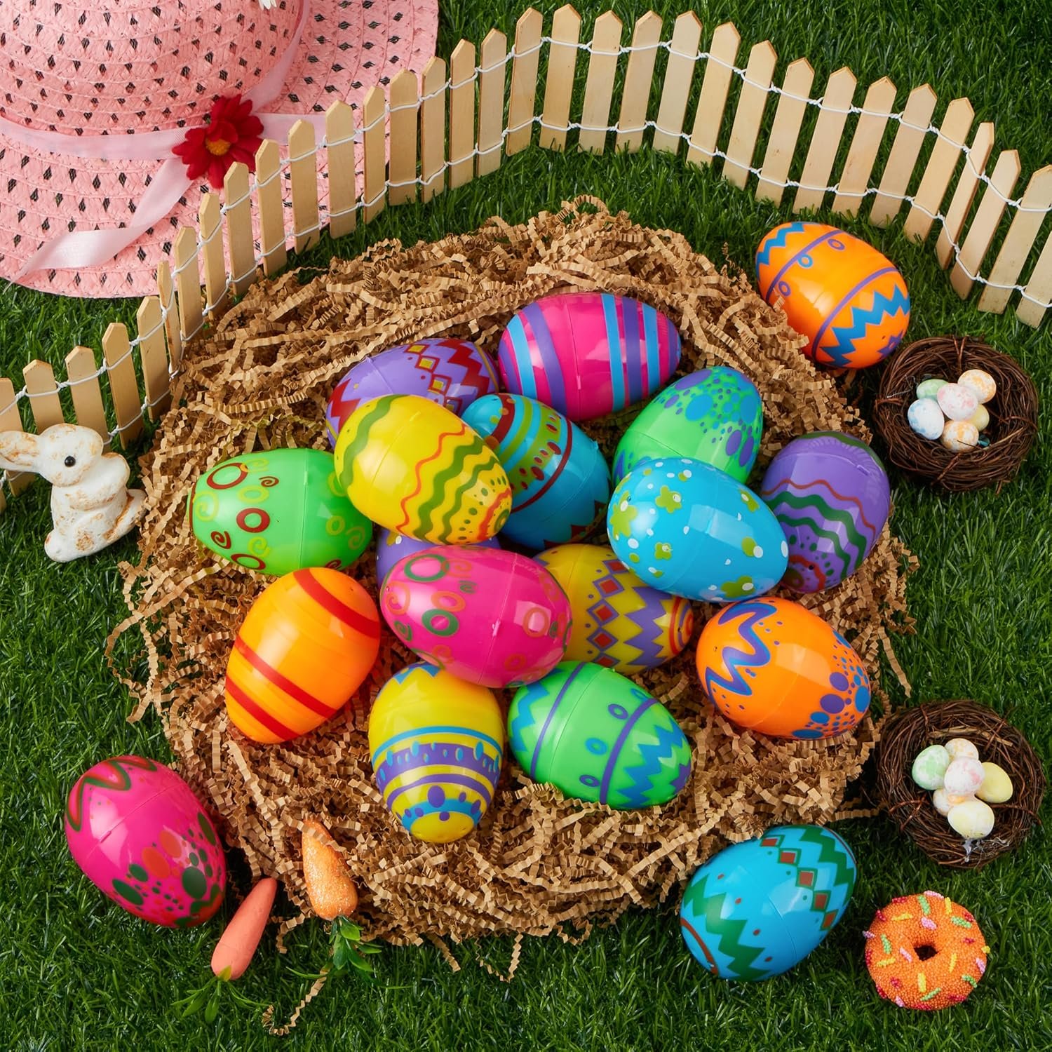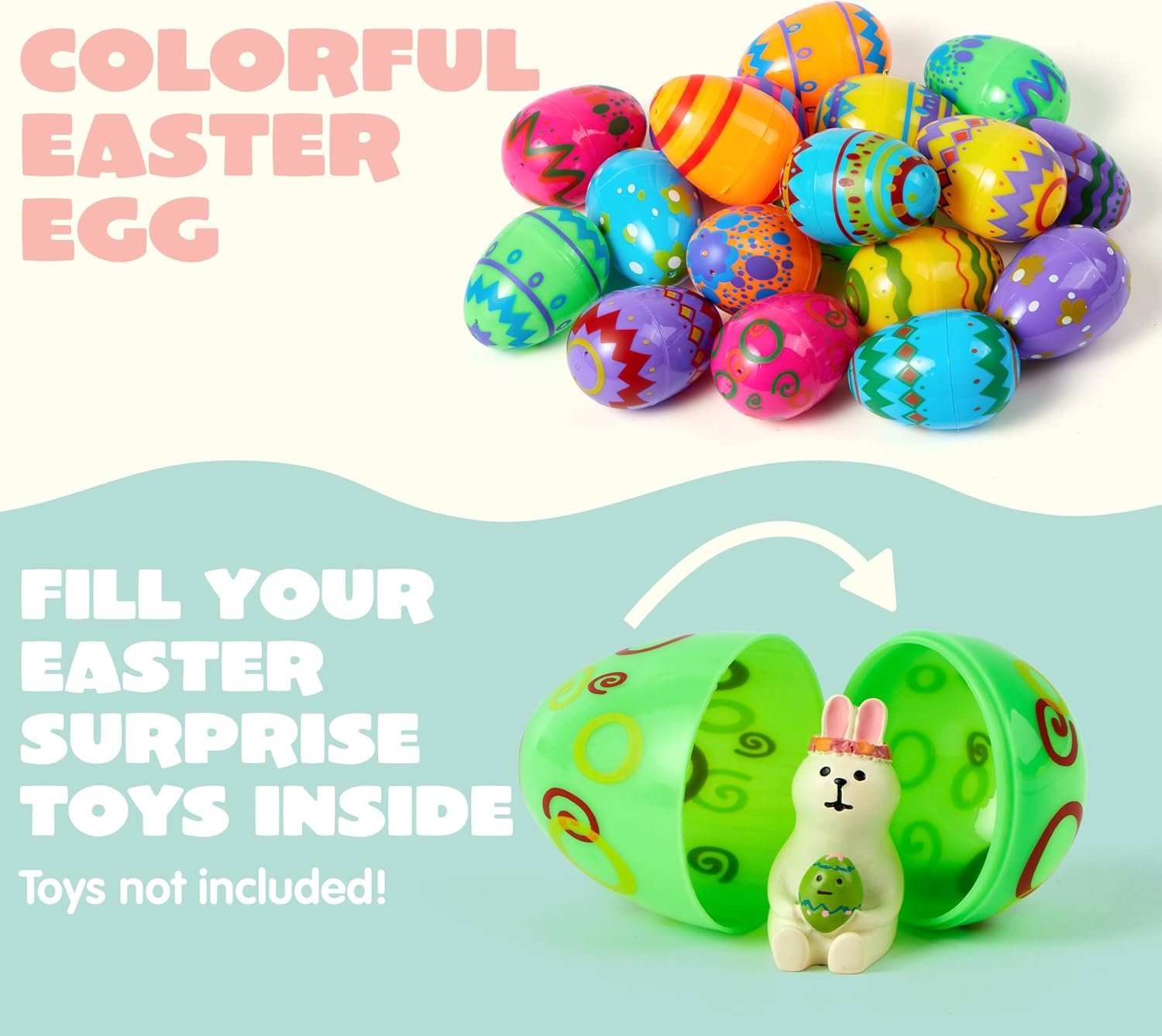 UNIQUE DESIGN. Our Fillable Easter Eggs Bulk with smooth edges, and Custom Designed Hinge Keeps Tops and Bottoms Together for easy assembly. These Plastic Colorful Easter Eggs will not break even if the kids drop them.