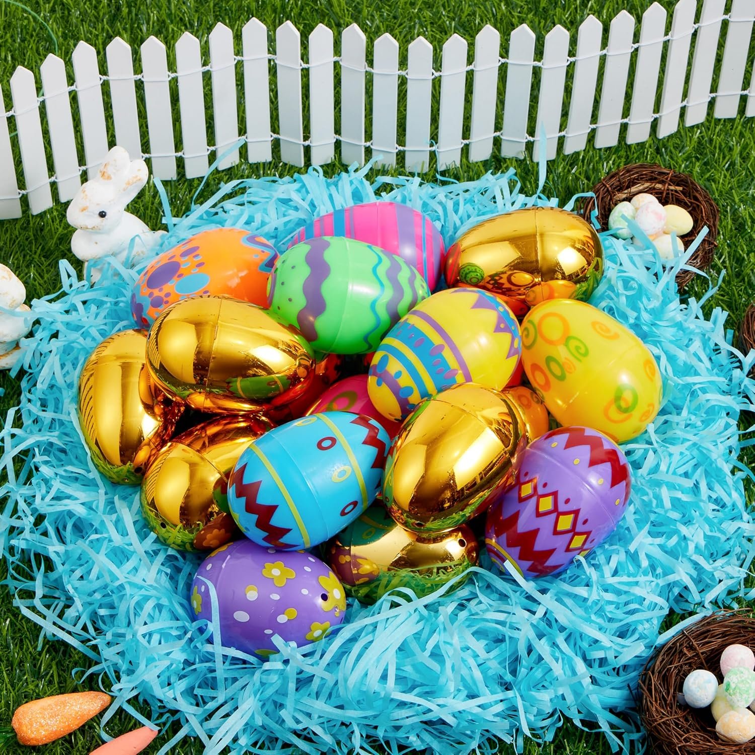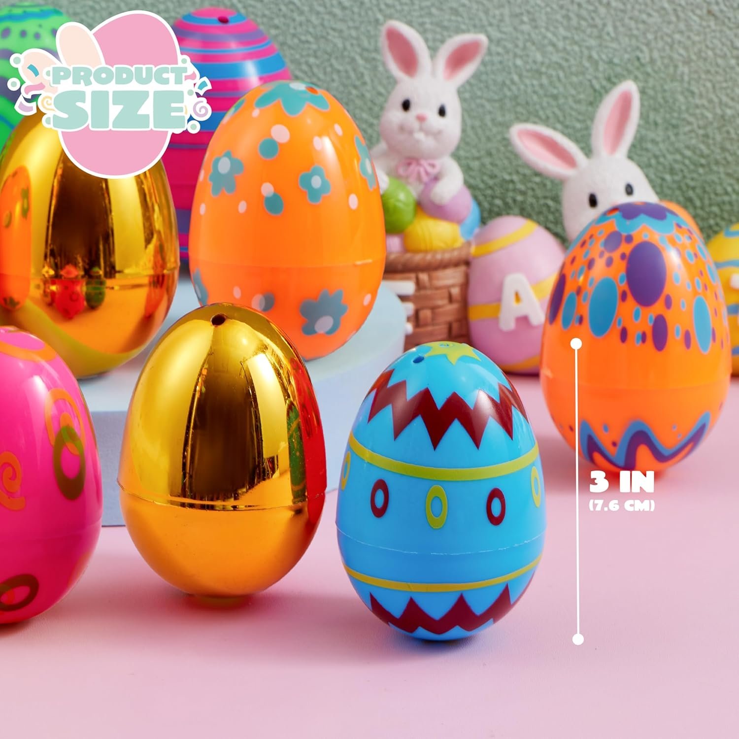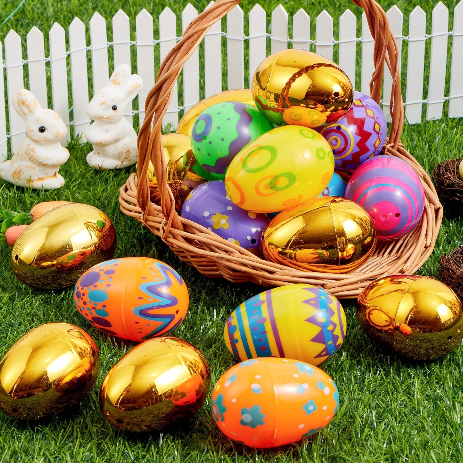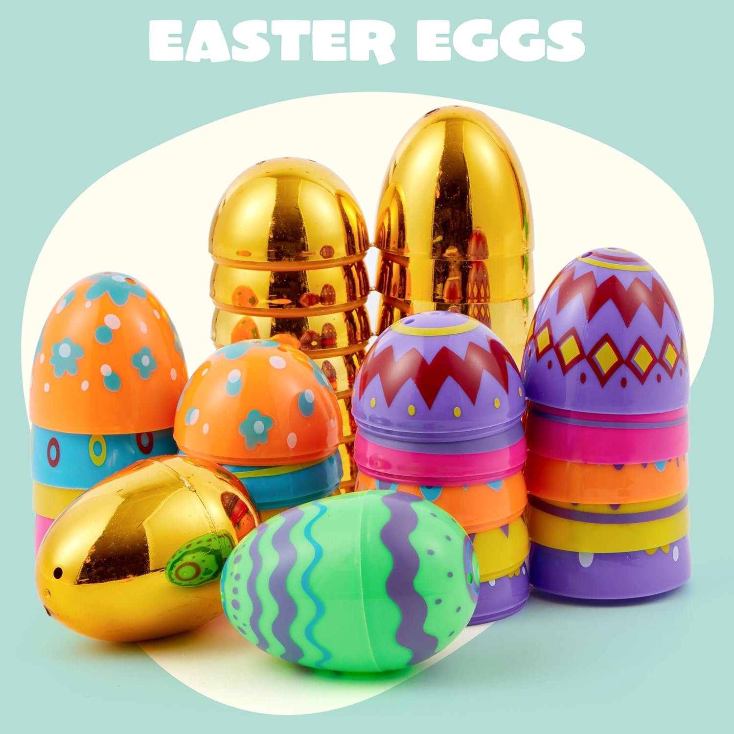 Comprehensive Set: Get ready for an eggstravaganza with our 44 pcs pack Easter Eggs, including 36 printed eggs and 8 enchanting golden eggs! This delightful mix is perfect for adding an extra element of surprise to your egg hunt.
