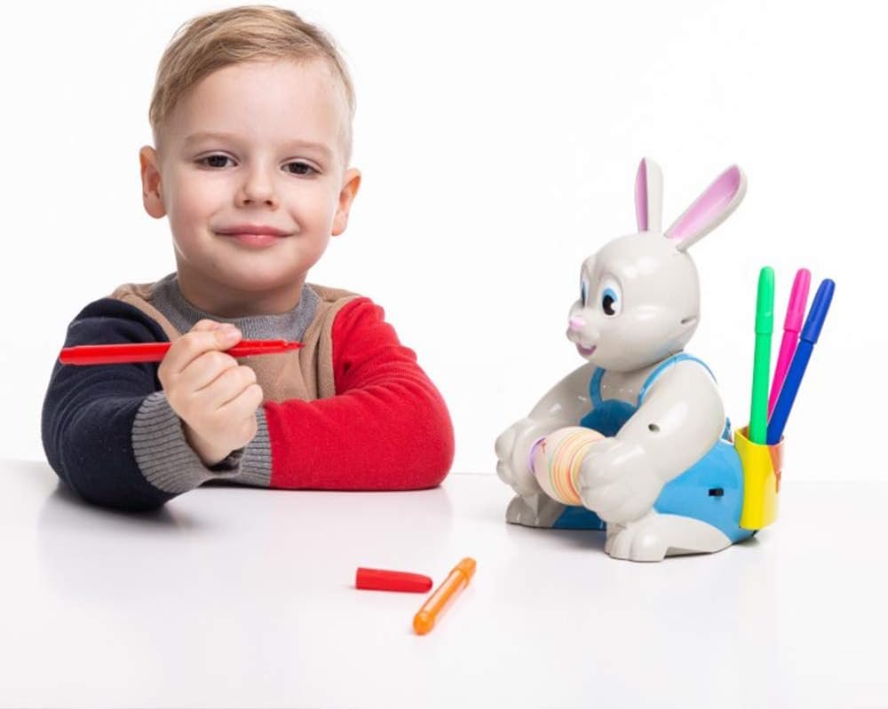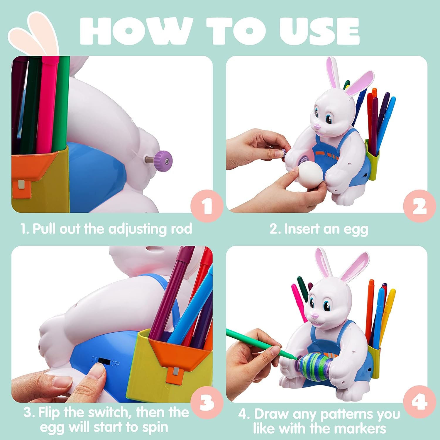 UNIQUE DESIGN. The Bunny Holds the Egg Between Paws and Turns the Egg Automatically Once Switch is Turned On! Insert a Blank Egg and Busy Rabbit Spins the Egg while you Draw! Easter Egg Bunny Decorator Coloring Kit with Spinner is Made of Sturdy and Strong Nontoxic Plastic, Water-Base Vibrant Markers are Highly Pigmented, Long Lasting. It is suitable for children over 72 months to play. Easy to decorate your own Easter eggs with JOYIN Easter Egg Spinner Decorating kit!