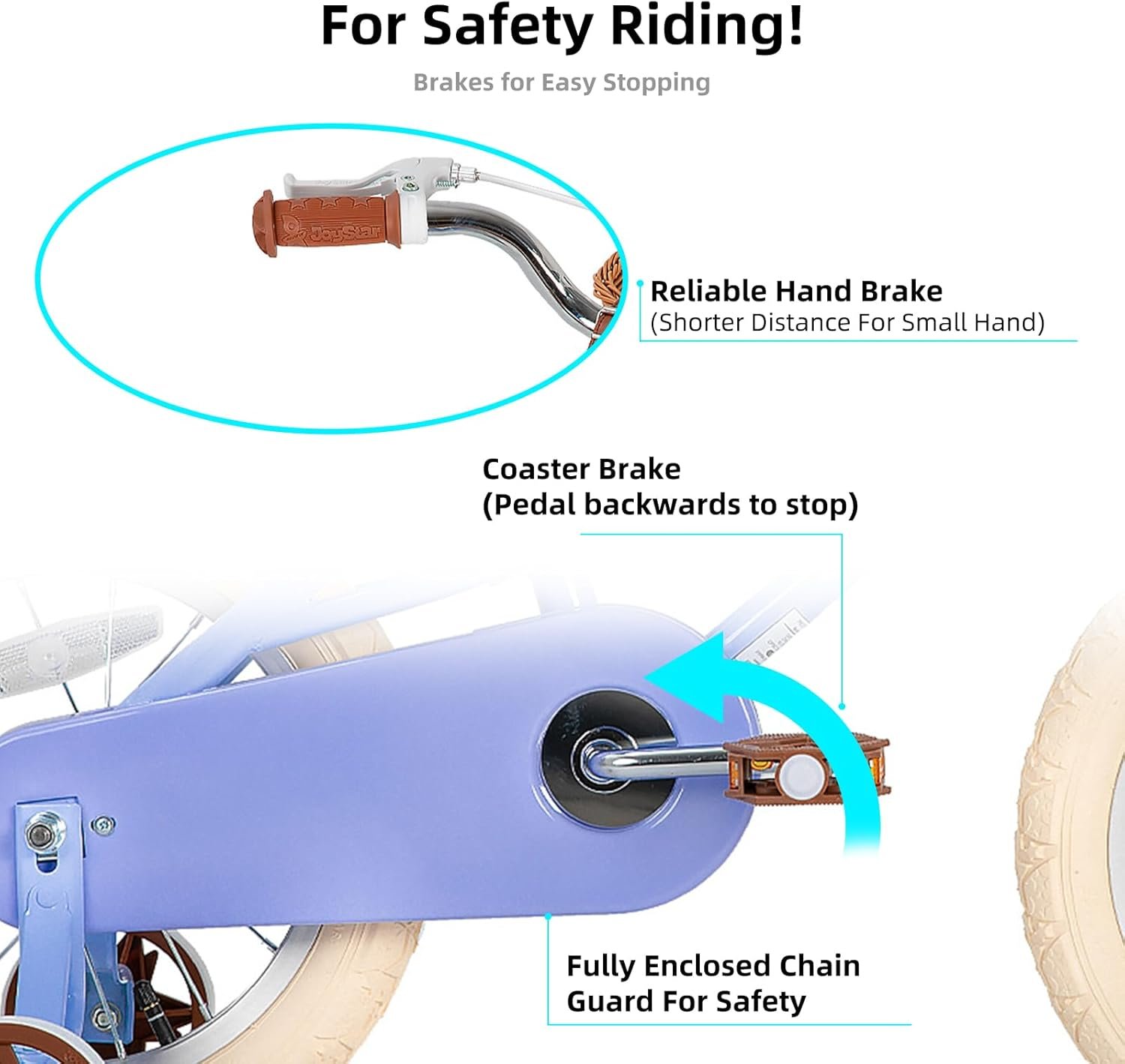 3, Safer Riding! The Front hand caliper Brake plus rear coaster/foot brake offer ample stopping power with more safety, wide 2.125″ pneumatic tires add more stability, Sturdy steel frame and crank, Non-slip resin pedal, enclosed chainguard, front & rear reflectors and wheel reflectors make this bike safe to ride.