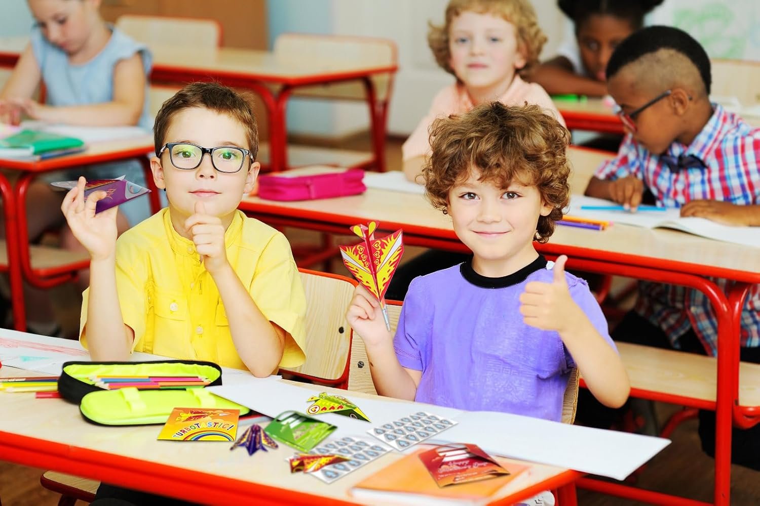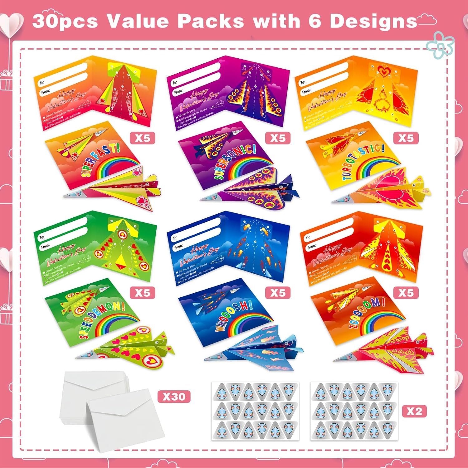 Super Value Kids Valentines Day Cards: Package includes 30pcs paper plane valentines day cards for kids classroom in 6 designs, 30pcs matching envelopes and 36pcs pilot stickers. Valentines paper airplane kits are perfect for kids to play on classroom activity, valentines party favors, Valentine giveaways