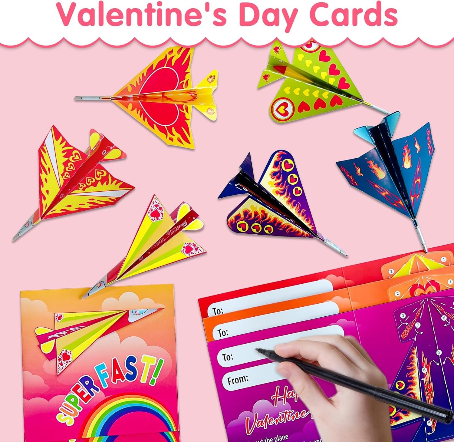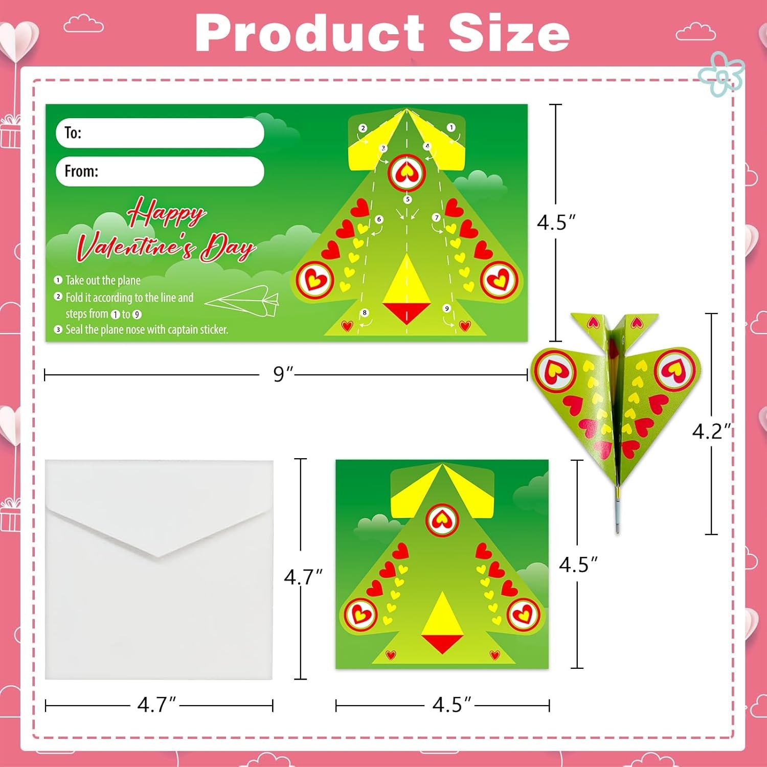 Easy to Play Valentines Day Gift Card for Kids: Kids airplane cards have perforated dotted lines for easily remove the plane model, and then just follow the simple instruction from step 1 to 9 to fold a plane shape, finally paste pilot sticker on the nose of plane. Choose Class Valentines Day gifts for kids and write the their names on the back, fold and play the airplane with classmates or friends on classroom, school girls and boys will love giving and receiving these fun Valentine card party favors