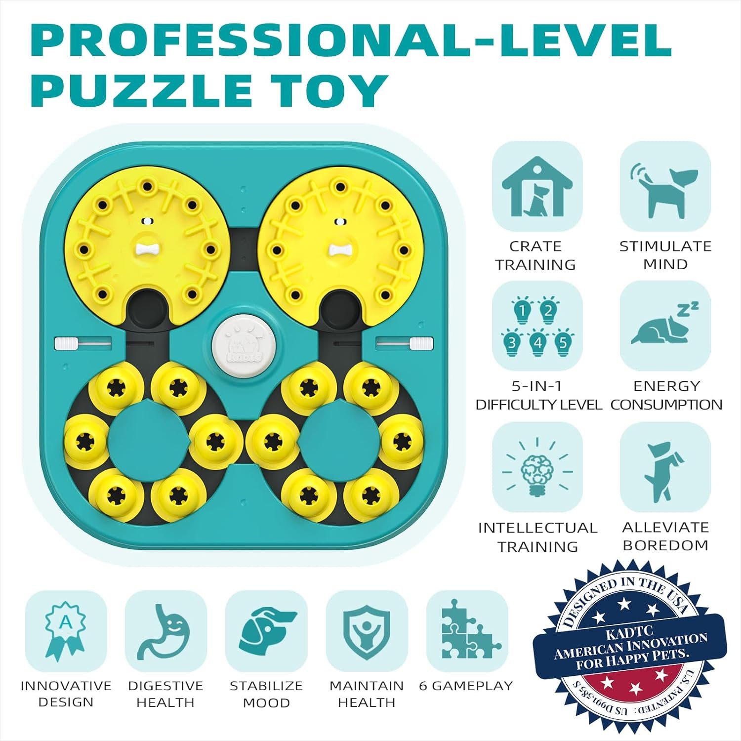 [World’s First & Only 6-in-1 Expert Dog Puzzle Toy] Meet KADTC’s patented all-in-one challenge system—the world’s first and only dog puzzle built with 6 gameplay modes and 5 progressive difficulty levels. From Level 1 (Beginner) to Level 5 (Expert), it keeps play fresh with a structured way for dogs to learn, solve, and level up through rewarding challenges.
