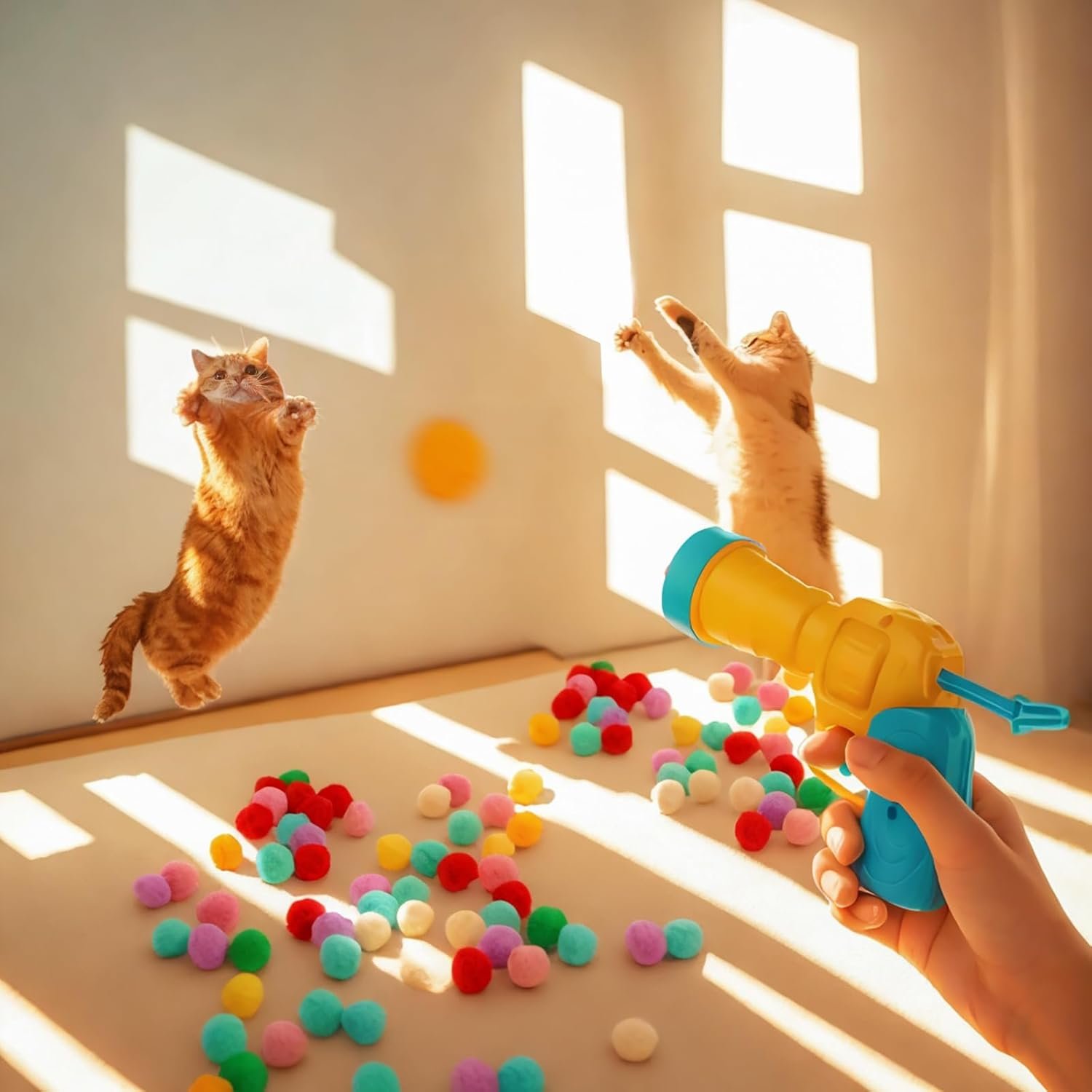 If you are busy, you can let them play with the soft cat pom pom balls. If you are free, you can play with them by shooting the balls for your furrry friends, which can strongthen your relationship.interactive cat ball launcher