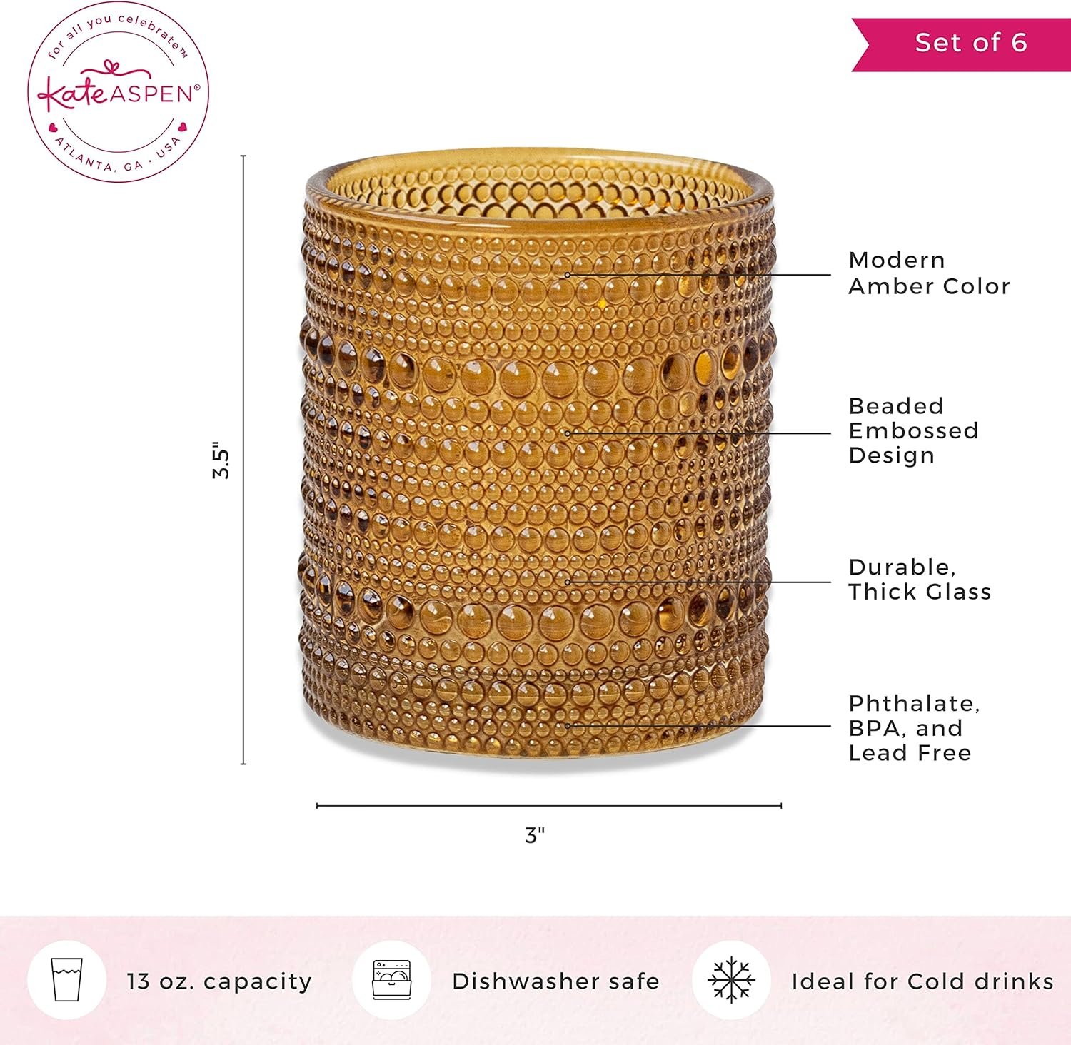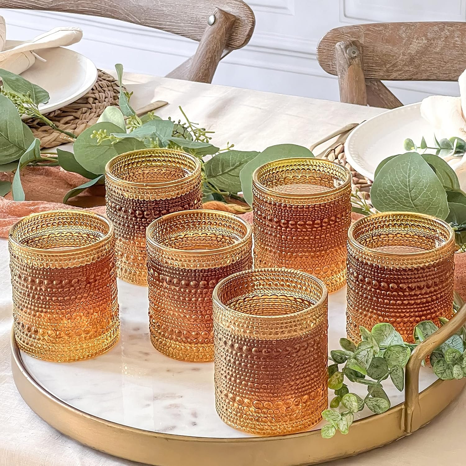Our 10 oz. Textured Beaded Amber Drinking Glasses (set of 6) are mesmerizing! The embossed glass design and the amber color make your drinks come alive, you are sure to feel like you are drinking from a piece of art. These beautiful glasses are lead free. They are perfect for your favorite holiday cocktails or baby shower mocktails. They make a table setting come alive and add brilliance to your bar cart. These make great groomsmen gifts accompanied with their favorite spirit of choice. Can’t figure out what to bring your favorite hostess – a set of these glasses will surely impress. What do you get the couple that has everything for a housewarming gift? These glasses of course! Each glass is wrapped in bubble wrap and shipped in the highest quality materials to insure a safe ride to your home. You can’t go wrong when gifting these beautiful vintage inspired cocktail glasses. The 10oz size is also perfect as a juice glass for your morning or just the right amount of smoothie. With all these great attributes you will want to make sure to pick a few extra sets! These ribbed textured amber drinking glasses are also available in clear, grab a set of both and pair them together at your next house party!