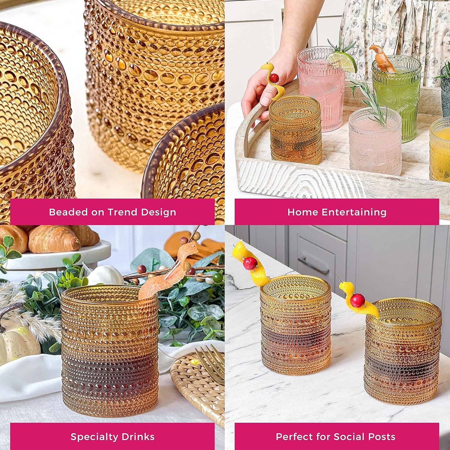 The 10 oz. Vintage Textured Beaded Drinking Glasses are embossed with polka-dot lines around the base and intricate circular patterns. Not only drinking glasses, they also make a great display for shelves filled with pampas grass or small bouquets of flower, office supplies, toothbrushes and so much more!