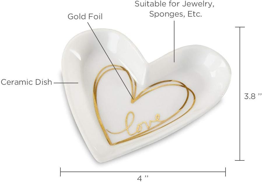 SWEET & UNIQUE – White ceramic heart shaped trinket dish features gold foil heart print.