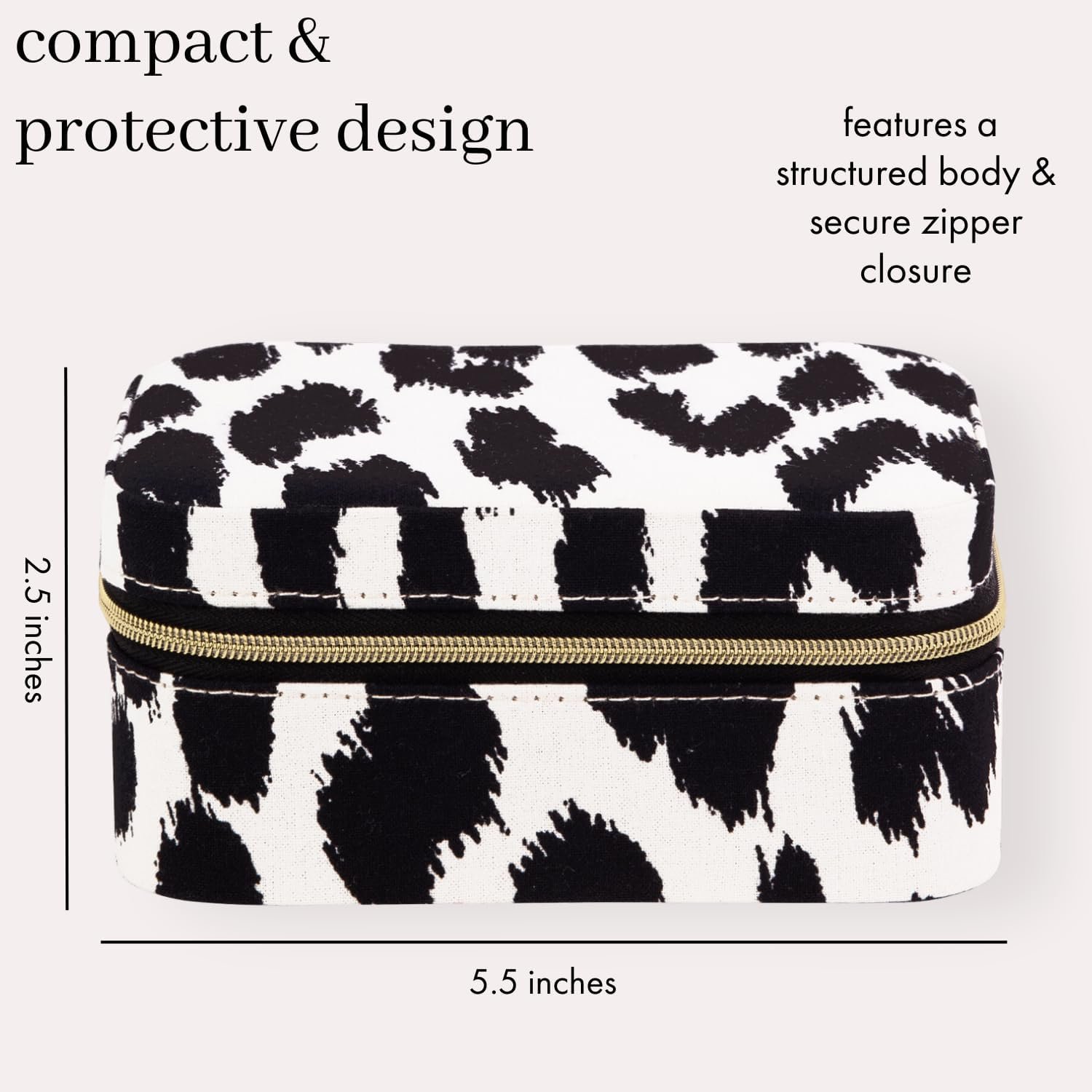 Jewelry holder measures 5.5 inches(W) x 2.5 inches(H) x 3.75 inches(D) so that it is lightweight and easy to carry with you at all times. Stash one inside your handbag and one in your suitcase and you’ll have one less thing to worry about at your next business trip or weekend getaway!