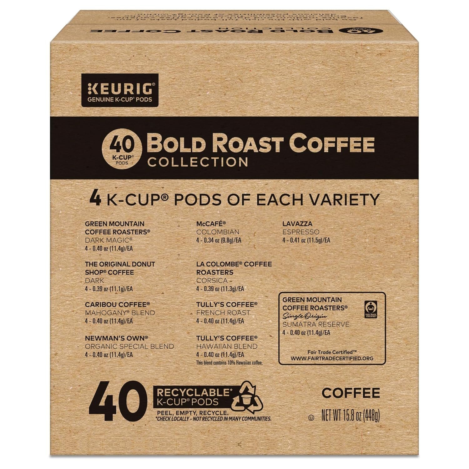 Go bold with the Keurig Bold Roast Coffee Collection, an assortment of our favorite medium and dark roast varieties famous for their rich, full-bodied taste. With 40 K-Cup pods spanning 10 varieties and eight of your favorite brands, you can discover all the deliciously bold possibilities and enjoy a more intense flavor in every cup. The Keurig Bold Roast Coffee Collection includes four K-Cup pods each of: Caribou Coffee Mahogany Blend (dark roast) Green Mountain Coffee Roasters Dark Magic (dark roast) Green Mountain Coffee Roasters Sumatra Reserve (dark roast) La Colombe Coffee Roasters Corsica (darker roast) Lavazza Espresso (medium roast) McCafé Colombian (medium-dark roast) Newman’s Own Organic Special Blend (medium roast) The Original Donut Shop Coffee Dark (dark roast) Tully’s Coffee French Roast (dark roast) Tully’s Coffee Hawaiian Blend (medium roast) Each K-Cup pod is filled with freshly ground coffee beans and is compatible with all Keurig single serve coffee makers. Simple. Delicious. And recyclable.* Enjoy the same great-tasting coffee you know and love, and when you’re done, just peel, empty, and recycle. *Check locally, not recycled in many communities.