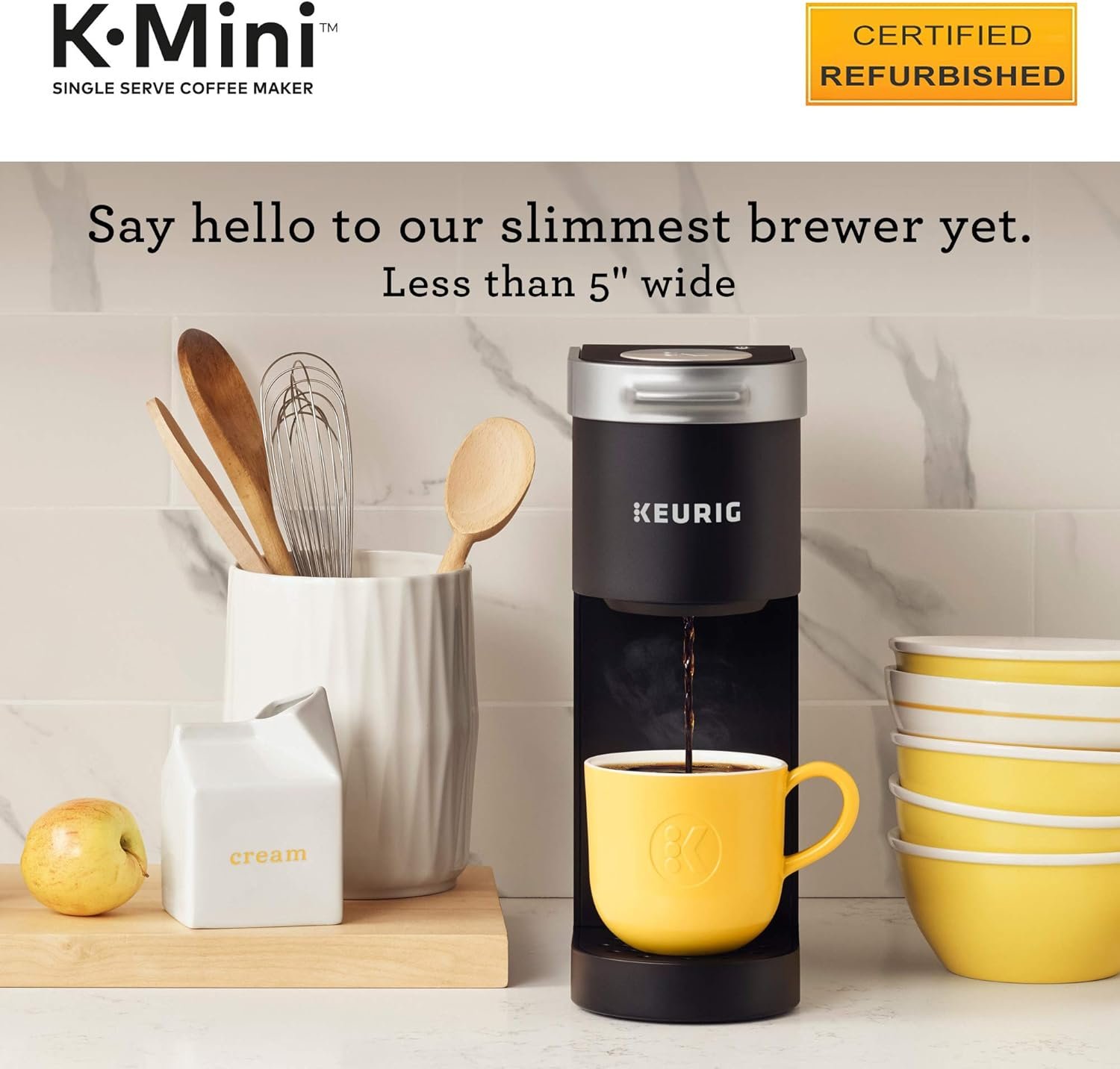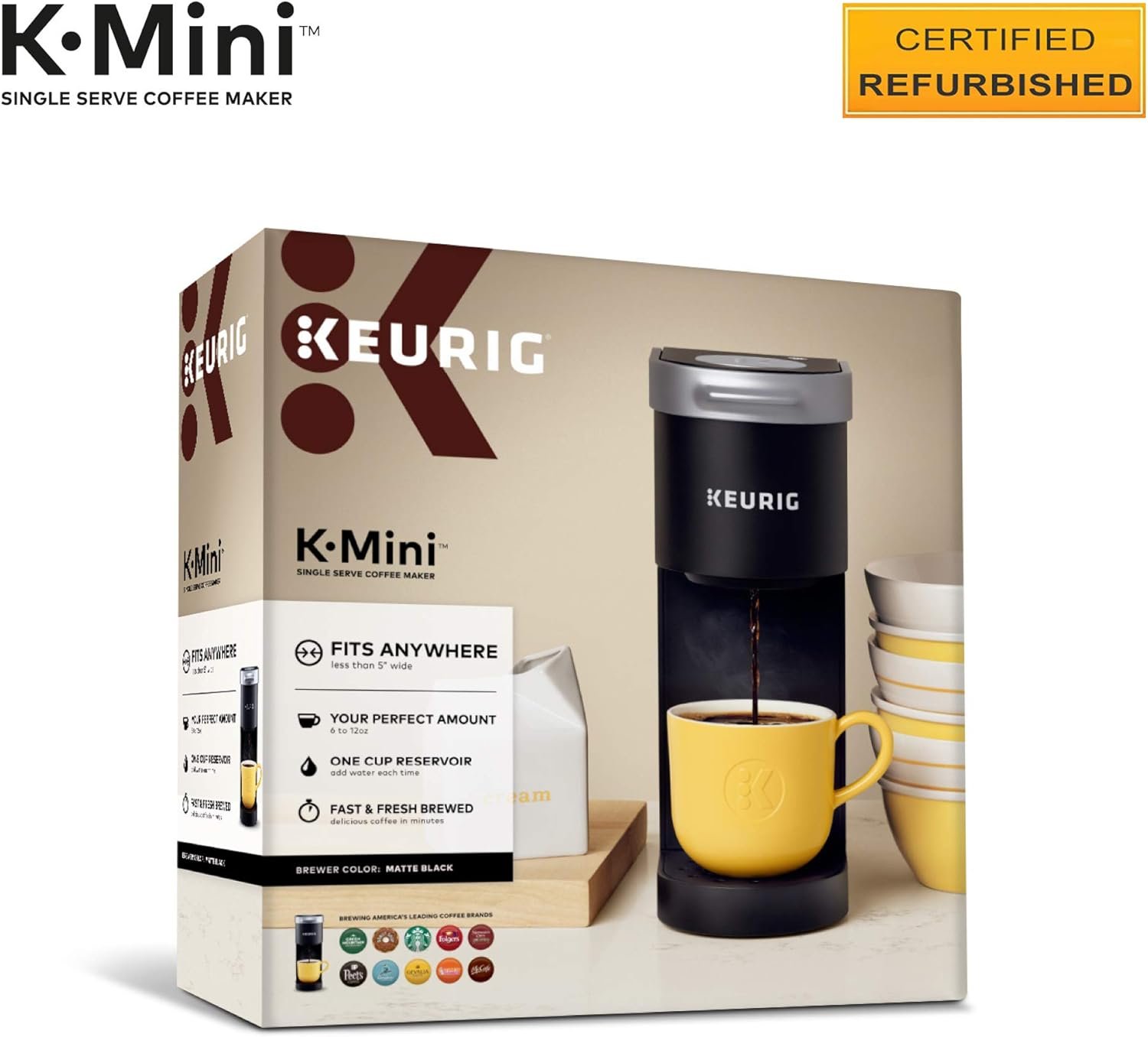 Make anywhere perfect for great coffee with the Keurig K-Mini Single Serve Coffee Maker in Black. Less than 5 inches wide, it is perfect for small spaces. Brew any cup size between 6 to 12oz with Keurig K-Cup pods. Just add fresh water for each brew and you’ll get delicious coffee in minutes. It offers cord storage for easy transport and tidy countertops. The cord is 26 inches and tucked into the back of the brewer. It may have to be pulled out to extend to its full length. It has a one-cup reservoir to add fresh water before each brew. The removable drip tray accommodates travel mugs up to 7.0 inches tall and holds a full accidental brew for easy cleanup. Auto-off feature turns off your coffee maker 90 seconds after your last brew, helping to save energy. It is compatible with the My K-Cup universal reusable coffee filter. This is a renewed product backed by a 90-day warranty.