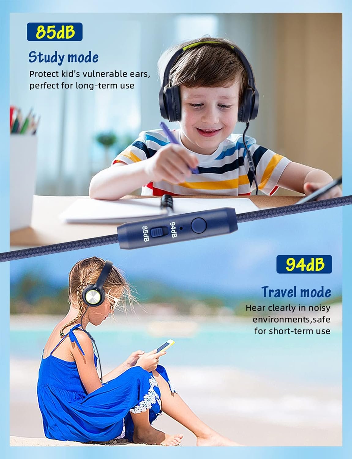 [Kid-safe Volume 85dB/94dB Limit Switch] Designed with a volume limit switch on the audio cable, these toddler headphones protect the vulnerable and sensitive ears of kids, the 85dB volume protects in normal environments, while the 94dB volume is suitable for noisy environments such as public parks, cars, airplanes, listen to listening every melody and lyrics clearly meanwhile protecting kids’ hearing