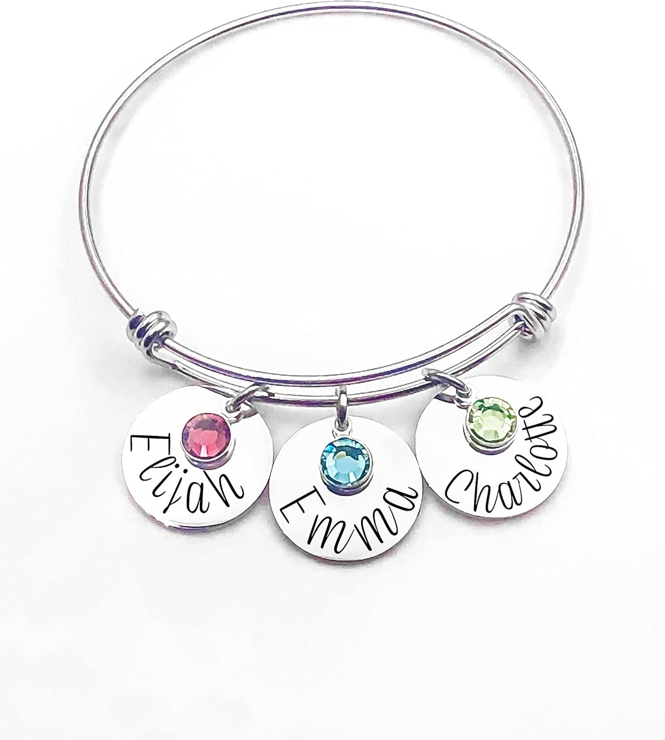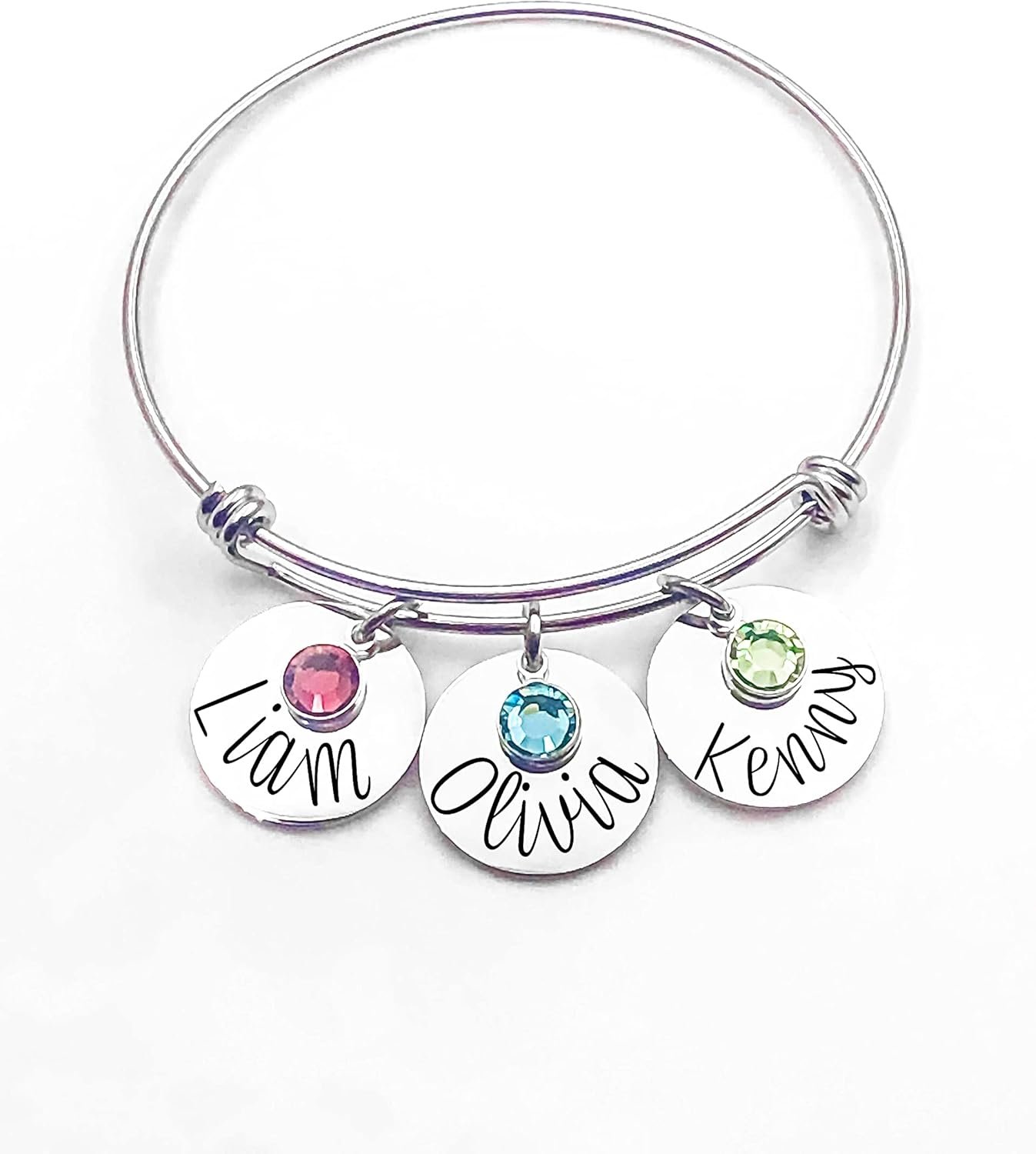 Stainless steel expandable bangle bracelet, features Stainless steel bangle Name charm and crystal.