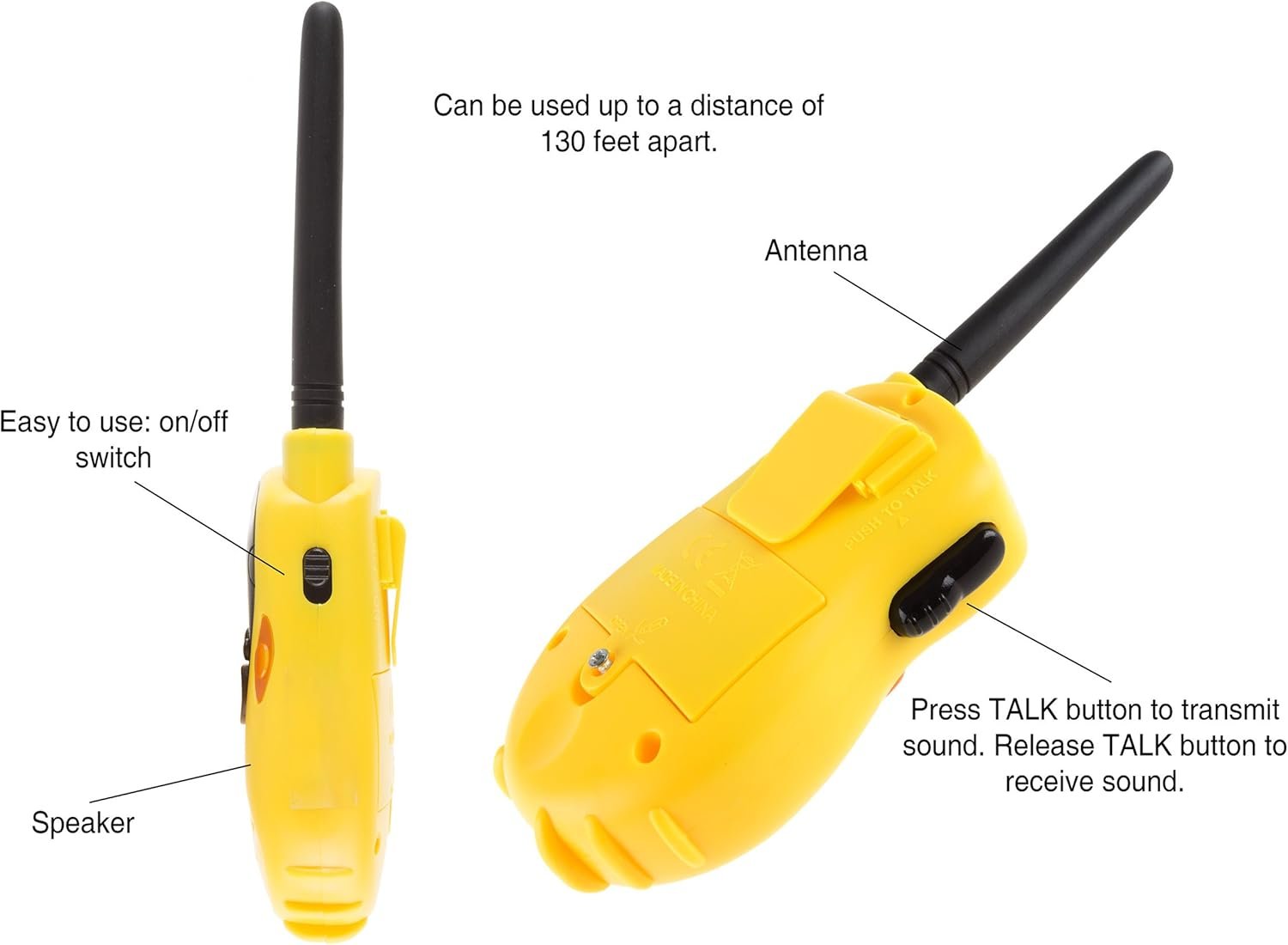 EASY TO USE – Ideal for children aged 3 and up, this set is easy to operate. Equipped with an on/off switch, TALK button to transmit sound and a soft, flexible antenna, your kids will be able to use them with ease.