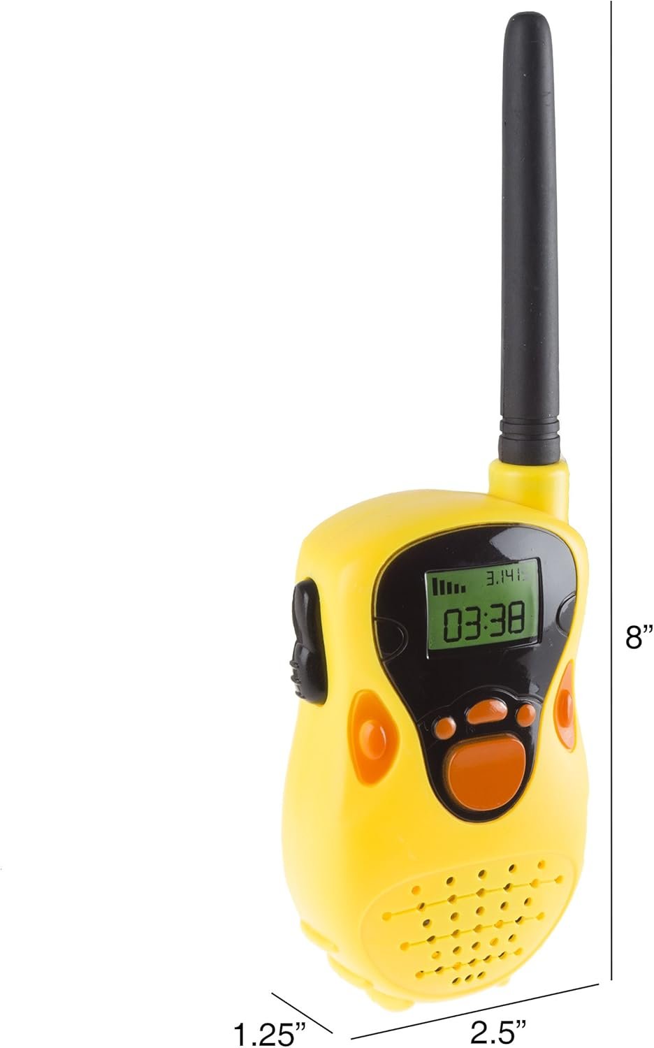 PRODUCT DETAILS – Comes with 2 walkie talkies. Can be used up to 130 ft. apart. Dimensions: (H)8” x (L)2.5” x (W)1.25”. Each walkie talkie requires one 9-volt battery (batteries not included). Recommended for Children 3 and up.