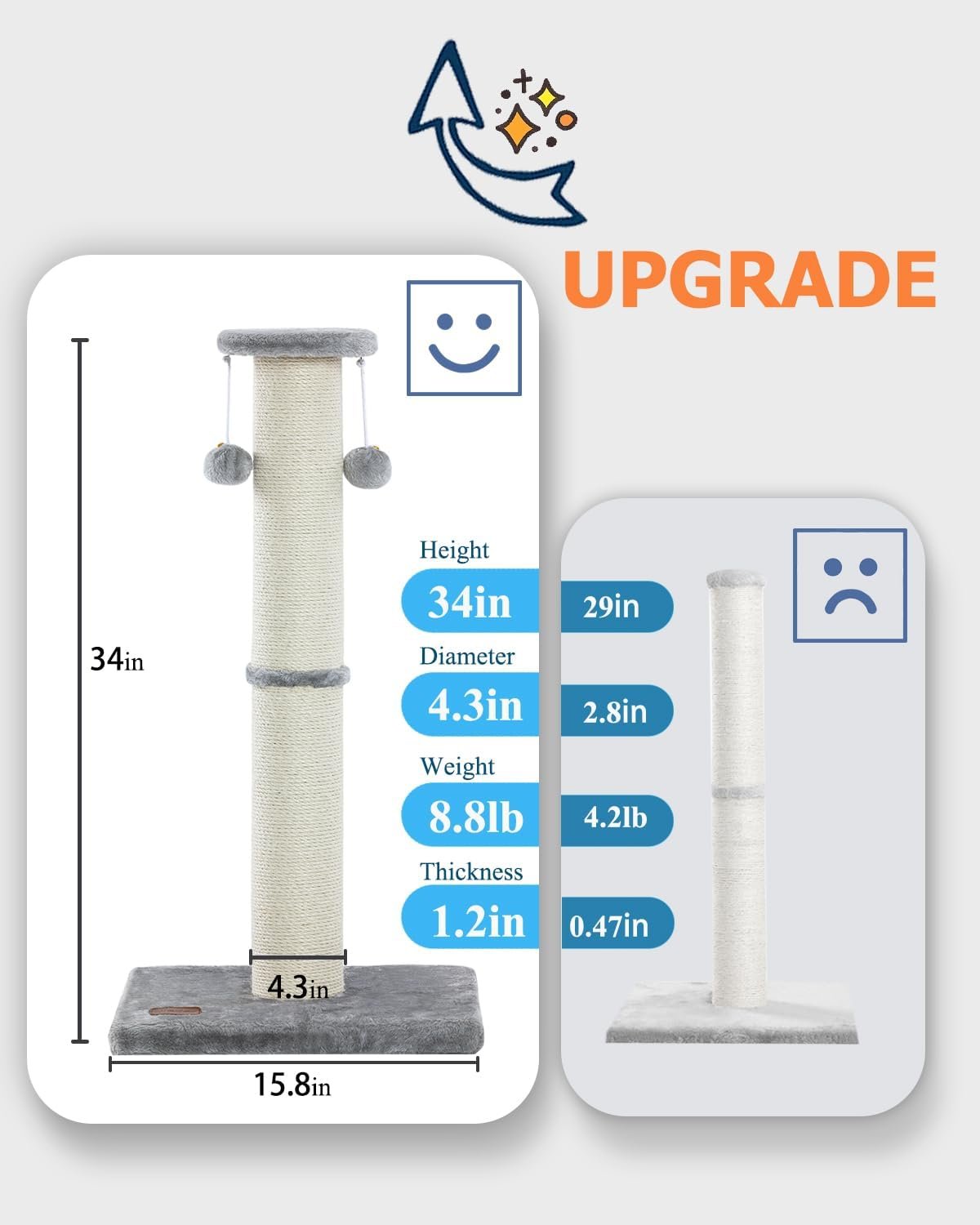 Tall and Sturdy: Our 34-inch tall cat scratching post is designed to provide ample height for cats to stretch and scratch comfortably. The sturdy construction ensures stability during vigorous scratching sessions, making it a durable choice for indoor cats of all sizes and ages.