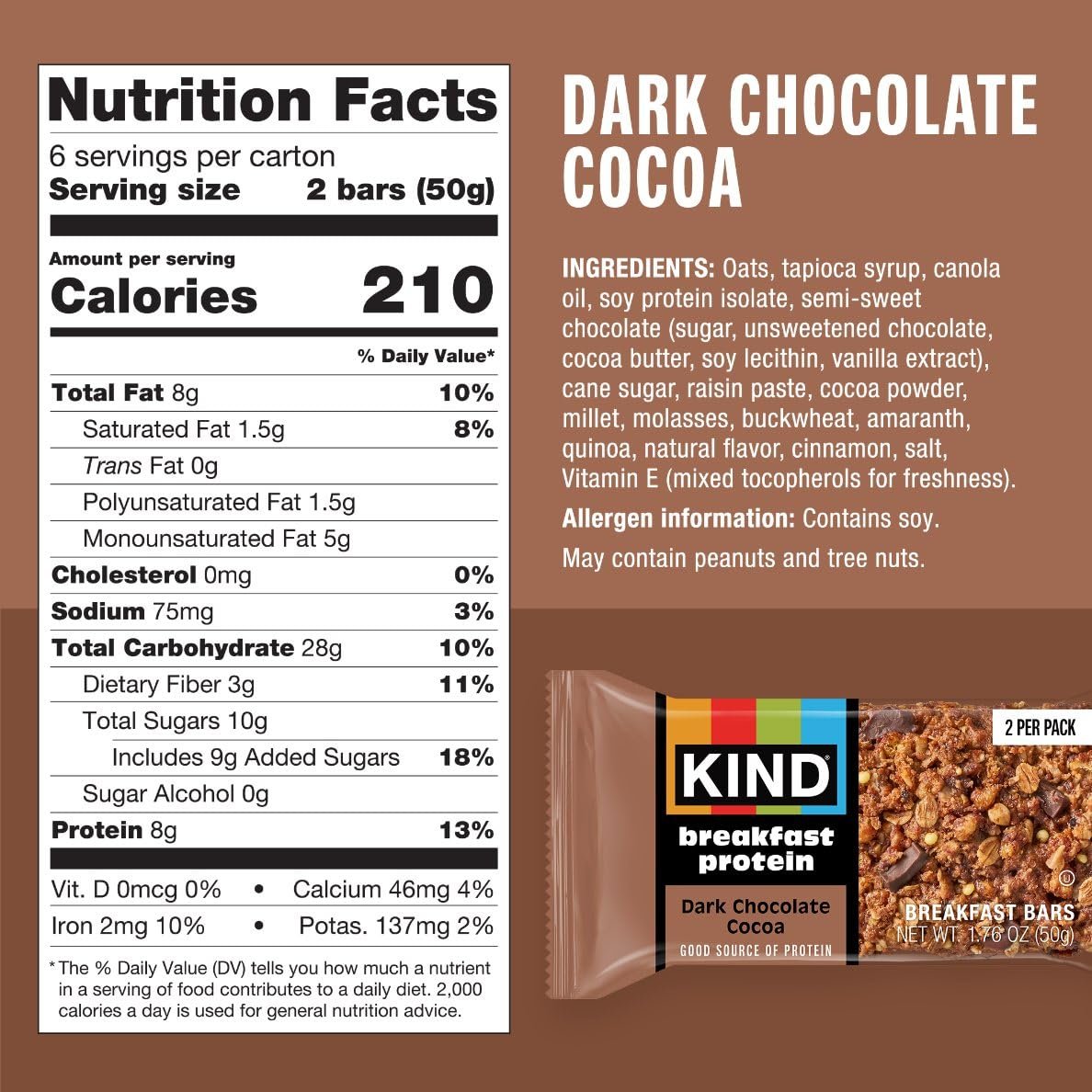 KIND Breakfast Protein Bars, Dark Chocolate Cocoa, Healthy Snacks, Gluten Free, 8g Protein, 6 Count