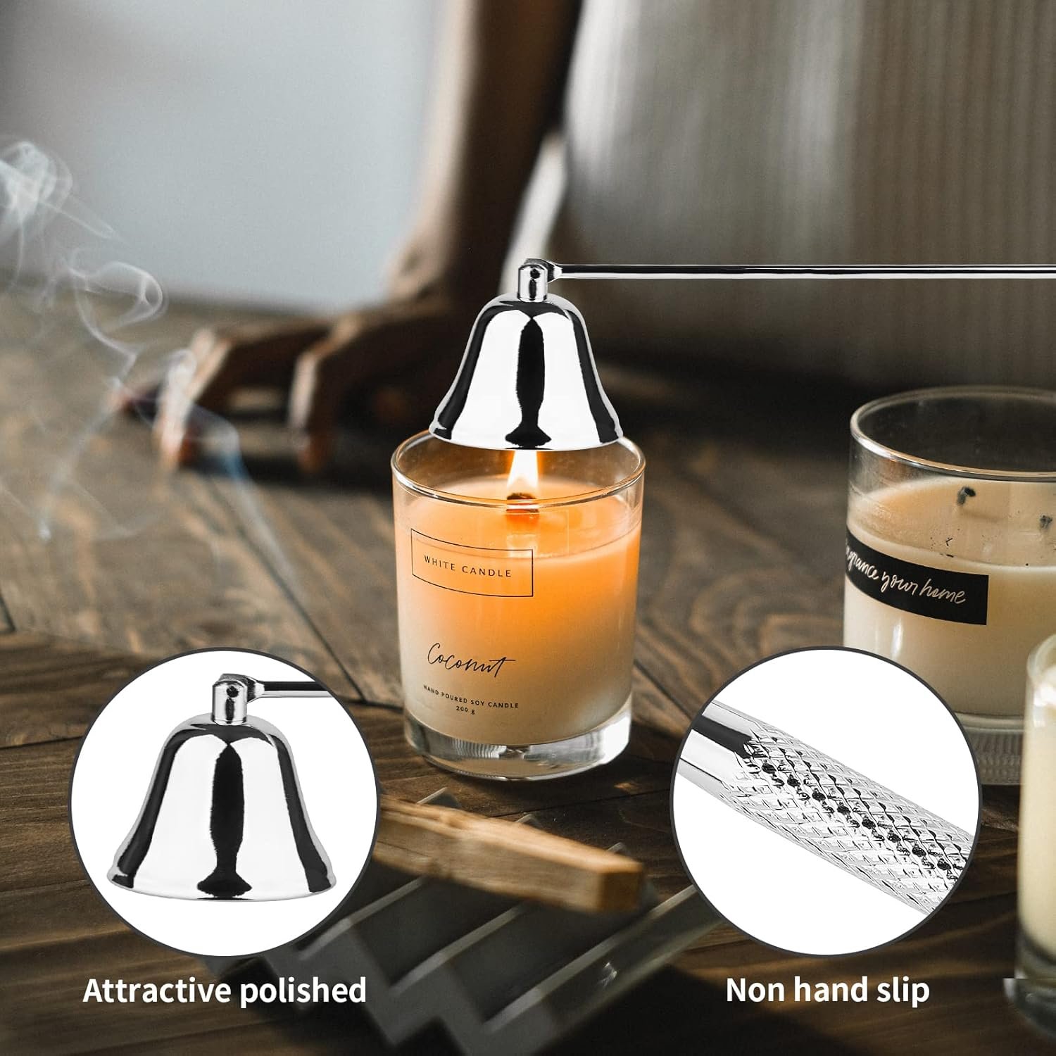 Candle Snuffer: candle extinguisher can extinguish your candle in safer and more correct way. Keep the snuffer just above the flame to snuff it out with minimal smoke and to prevent wax flying off tip of candle.