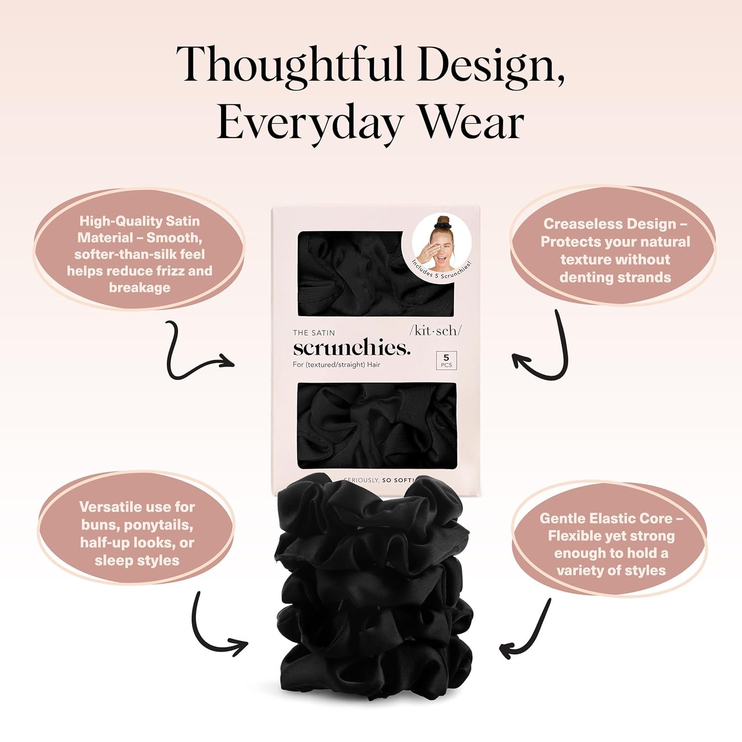 FRIZZ FREE STYLING WITH SATIN SCRUNCHIES: Wake up to smoother hair with Kitsch scrunchies designed to reduce friction and minimize creases. These satin scrunchies glide gently through strands to help control frizz while maintaining a soft, comfortable hold. Ideal for daily styling or overnight wear, they help keep ponytails, buns, and relaxed hairstyles looking smooth without tugging delicate hair.