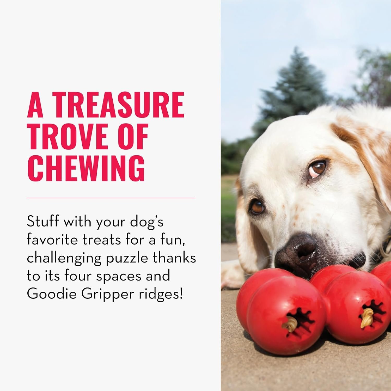 A treasure trove of chewing! Stuff KONG Goodie Ribbon’s four spaces with treats and the Goodie Gripper ridges inside make getting the nibbles out a mentally challenging puzzle for dogs. Durable KONG Classic Rubber satisfies natural chewing instincts while providing a durable solution that keeps dogs engaged. Ideal for stuffing with KONG Easy Treat, KONG Snacks of a dog’s favorite kibble.