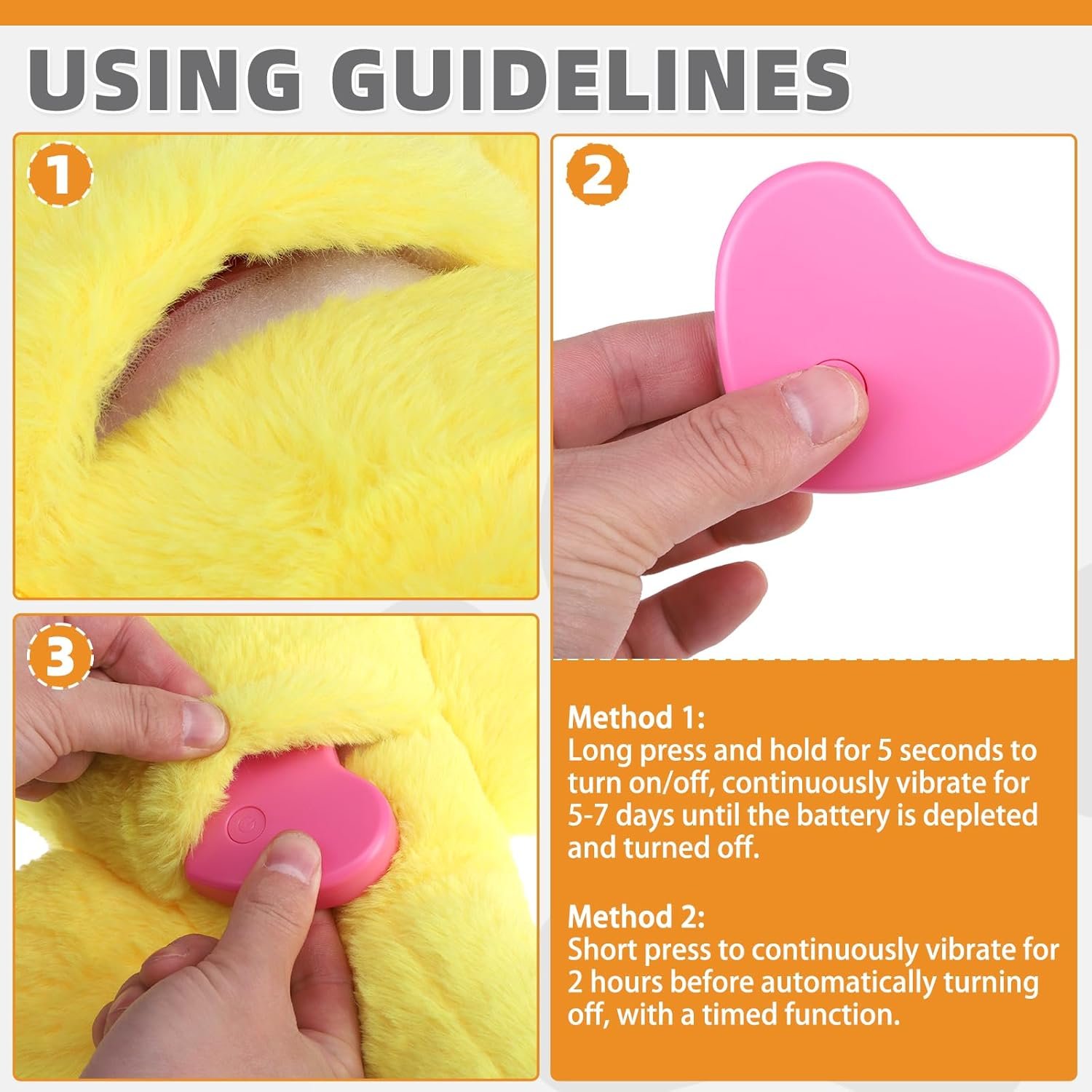 EASY TO USE: The product is easy to use and has two ways of use: Method 1: Press and hold for 5 seconds to turn on or off, and continue to vibrate for 5-7 days until the battery is depleted and turned off. Method 2: Short press to continuously vibrate for 2 hours before automatically turning off, with a timed function. Put it in the belly pocket of the duckling to simulate a heartbeat. In addition, the pocket magic tape design makes it safer and prevents dogs from accidentally eating it.