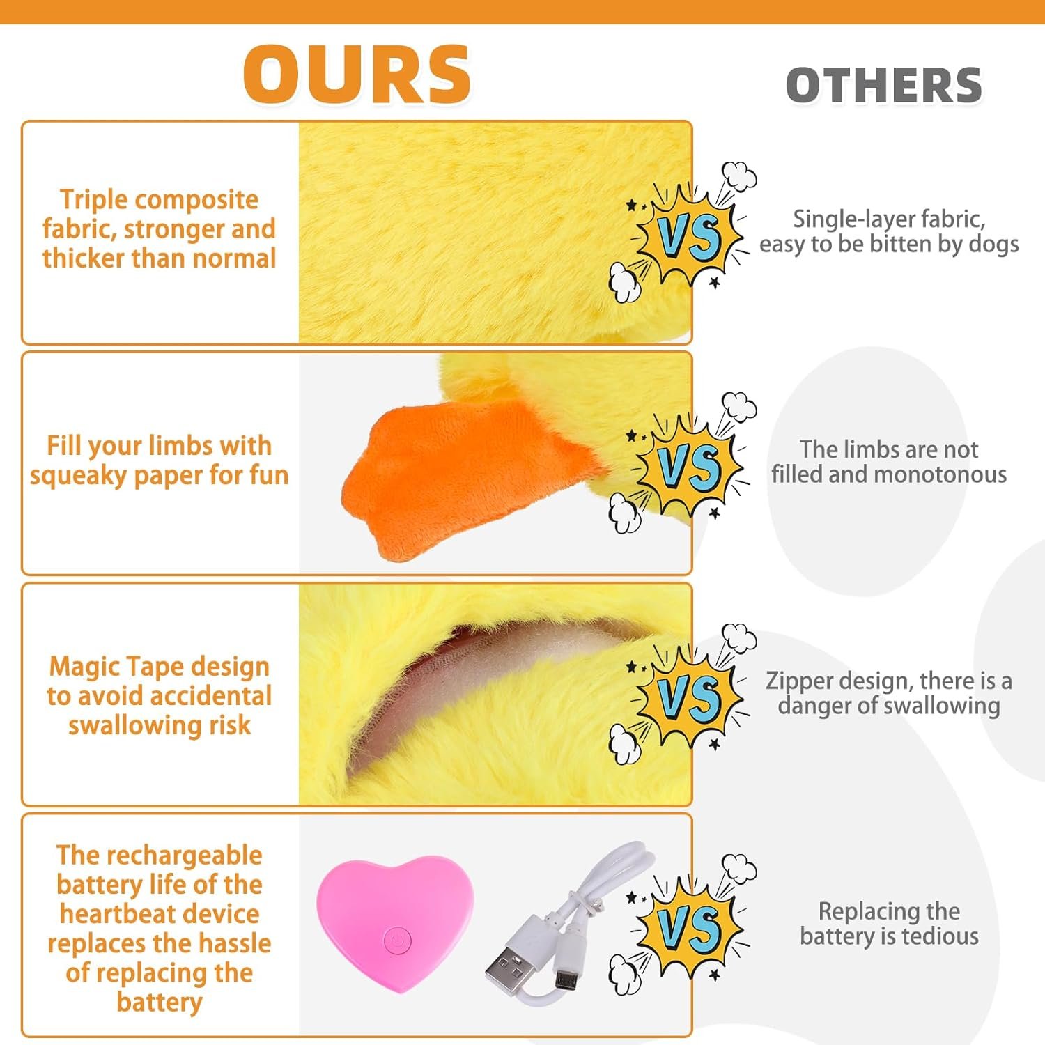 PLUSH TOY WITH HEARTBEAT: This product includes a cute toy and a real heartbeat simulator, no battery required, rechargeable, and includes a data cable. Soothing dog toys are made of comfortable and skin friendly fabrics that can be machine washed when removing the heart. The eye-catching yellow duckling design can also be used as an interactive toy to accompany the puppy and increase its fun.