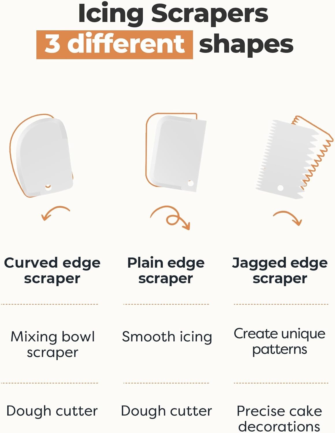 3 Edges of Cake Scrapers: This cake decorating set includes 3 different icing comb scrapers, so you can make various designs on your cake. With one rounded scraper, one straight scraper, and one toothed scraper, you can easily create complex and stunning designs.