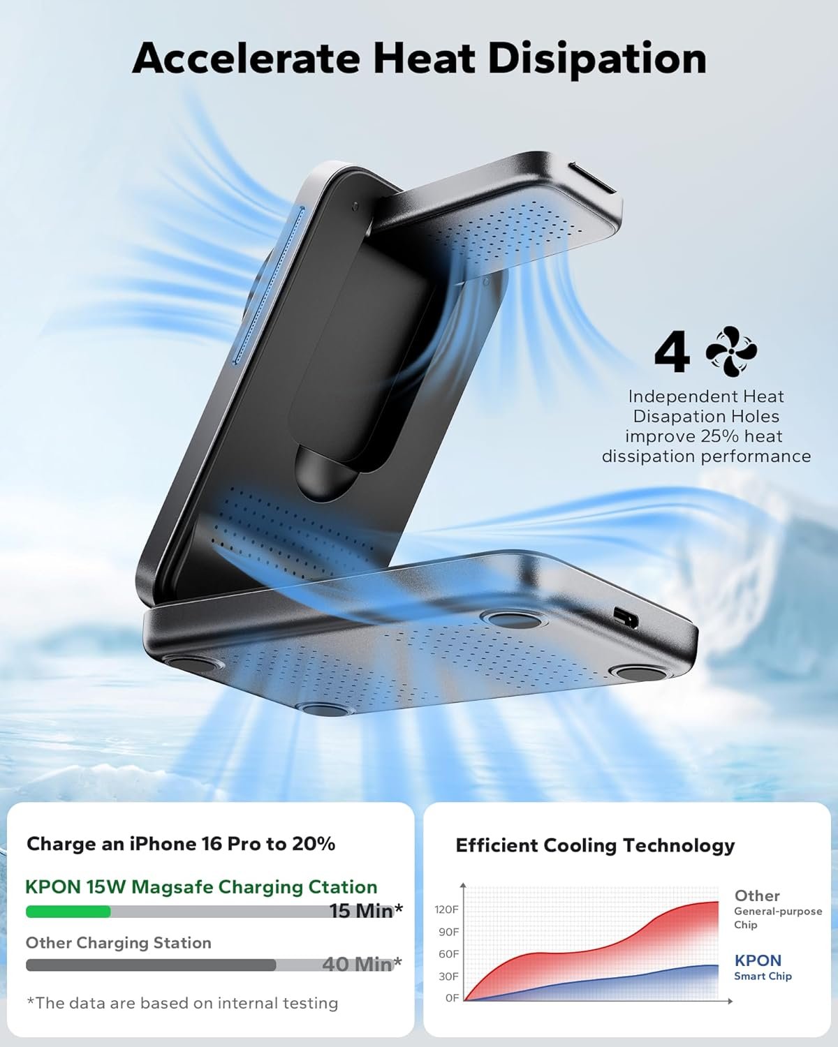 【Fast Charging and Efficient Heat Dissipation】Equipped with a high-efficiency chip, the wireless charging station can fully charge an iPhone 15 Pro in just 2 hours and 23 minutes. The charger’s body features multiple ventilation holes for efficient heat dissipation, effectively alleviating overheating during wireless charging