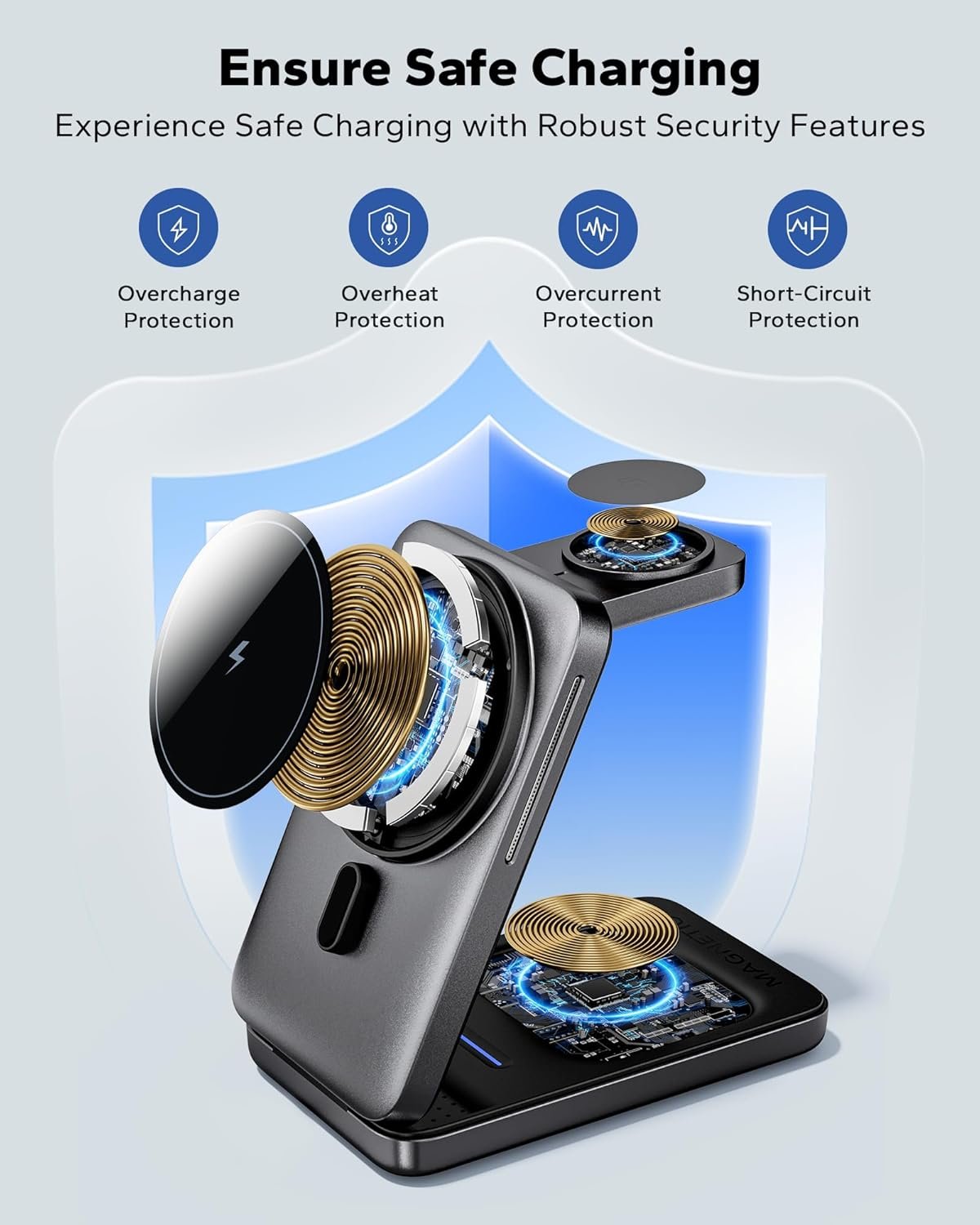 【Strong Magnet】This magnetic 3in1 charger stand features upgraded magnets for stable inductive charging. With N52-strength magnetic adhesion, it securely holds your phone. The rubber anti-slip pads on the bottom allow for easy angle adjustments, perfect for selfies or watching videos in landscape mode