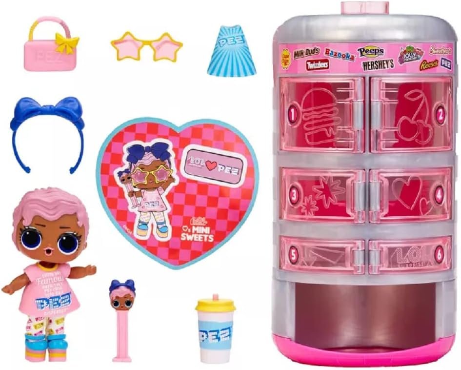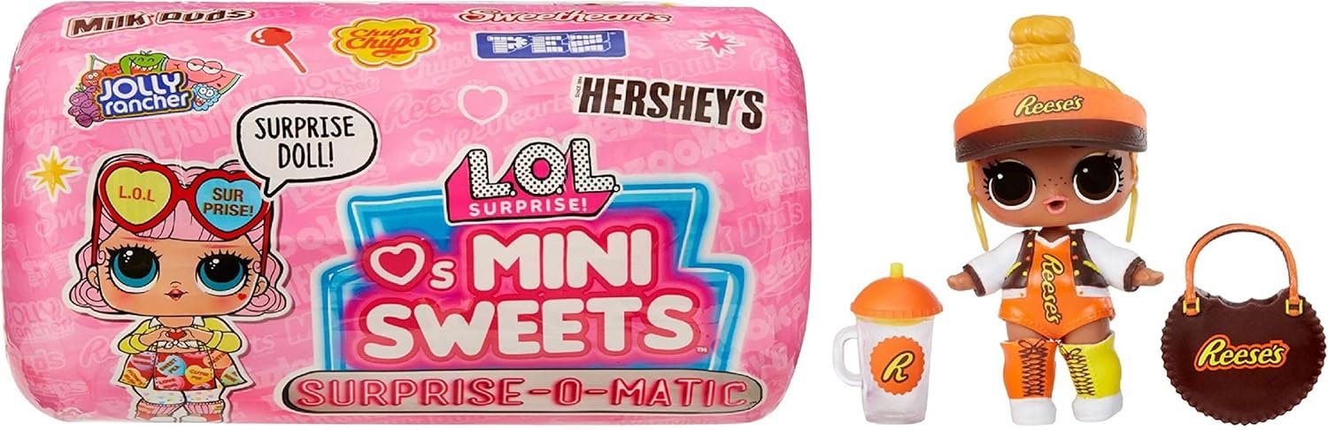 Introducing LOL Surprise Loves Mini Sweets Surprise-O-Matic™ Dolls in our brand new Surprise-O-Matic™ vending machine packaging! LOL Surprise has partnered with iconic candy brands to bring you LOL Surprise Loves Mini Sweets! Your favorite treats are now your favorite dolls! Find characters from Jolly Rancher, Hershey’s Chocolate, Reese’s, Chupa Chups, Milk Duds, Sweethearts, Twizzlers, Bazooka Joe, Pez, and Peeps. These B.B.s are as sweet as can be and love to have fun. With the Surprise-O-Matic™, unboxing these 9 cute surprises just got even more interactive and fun! Just the press of a button delivers each sweet surprise the same way you get your favorite candies from a vending machine. What will come down the Surprise-O-Matic™ for your B.B.? Press one of the buttons and find an outfit, shoes, bottle, accessories, or sticker. Feed or bathe your LOL Surprise Loves Mini Sweets Surprise-O-Matic™ doll for a water surprise! Will your doll cry, spit, or tinkle? Each LOL Surprise Loves Mini Sweets Surprise-O-Matic™ doll includes 9 surprises: (1) LOL Surprise Loves Mini Sweets Surprise-O-Matic™ doll; (2) Surprise-O-Matic™ vending machine; (3) Outfit; (4) Shoes; (5) Bottle; (6) Accessory; (7) Accessory; (8) Accessory; (9) Sticker. Collect all 12 brand new LOL Surprise Loves Mini Sweets Surprise-O-Matic™ dolls and complete your candy doll collection!From MGA Entertainment, creators of LOL Surprise™ OMG fashion and collectible dolls and pets, Rainbow High™ posable fashion dolls, Mermaze Mermaidz™ mermaid dolls with color change, MGAE Miniverse, Na Na Na Surprise dolls, Bratz® fashion dolls, MGA’s Dream Ella™ fashion fairy princess and unicorn dolls, MGA’s Glitter Babyz™, Lalaloopsy™, Baby Born® Surprise baby dolls and collectibles, Little Tikes® kids toys and many other favorite brands.