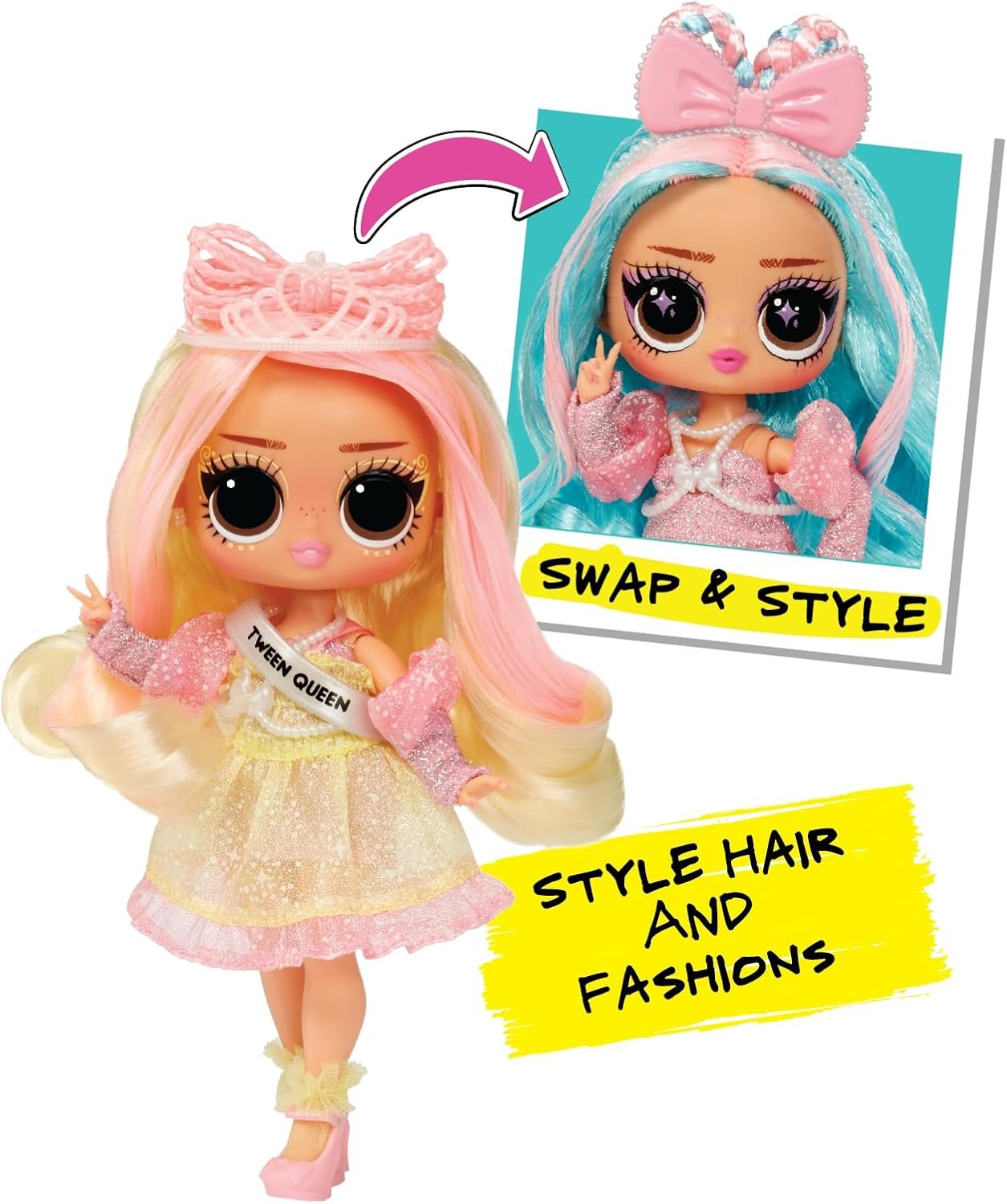 I’m in Be Tween, but right where I wanna be. Full of surprises & fierce style. Look out world, cuz here I come. Introducing the all-new L.O.L. Surprise Tweens Surprise Swap™ Fashion Doll Braids-2-Waves Winnie who comes with 2 unique looks and a swapping head feature for the ultimate customization and hair play experience! Winnie loves to spend her time sewing, but when it’s time to dress up for a night out with her BFFs, she transforms into a Tween Queen, making everywhere she walks her runway while posing with her favorite peace sign. Unbox 20+ surprises including a styling head, fabulous fashions, socks, shoes, a caboodle, a tiara, a sash, hair styling accessories, a hairbrush, a doll stand, and more! Change Winnie’s look in an instant by swapping out her pink and yellow hairstyle with the blue and pink styling head that can easily be attached to the doll’s body. Next, give her a quick outfit change and switch up her accessories including her earrings, headpiece, hair accessories, and more! Once you finish styling your doll, repeat the swapping feature and fashion and accessory changes over and over again to create endless mix and match looks! Pair the Tweens Surprise Swap dolls with the stylish new Surprise Swap™ Styling Heads that each come with gorgeous hair and hair accessories for even more customization! Each doll has stunning features, beautiful hair, her own glamorous style, and comes articulated for tons of posing opportunities. Accessories can be neatly stored in the adorable caboodle and the additional styling head can always be placed back on the head stand when not in use for easier clean up. Collect all 4 L.O.L. Surprise Tweens Surprise Swap™ fashion dolls: Braids-2-Waves Winnie, Bronze-2-Blonde Billie, Buns-2-Braids Bailey, and Curls-2-Crimps Cora.