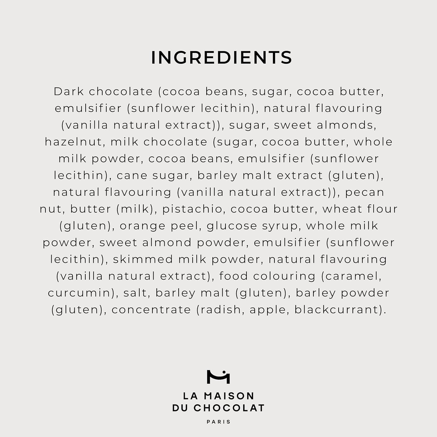 PRALINES GIFT BOX – Discover La Maison du Chocolat’s signature praliné recipes in a selection of assorted chocolate bonbons. Delight in a variety of textures crunchy, melty, crispy and silky with nutty, caramel base notes.