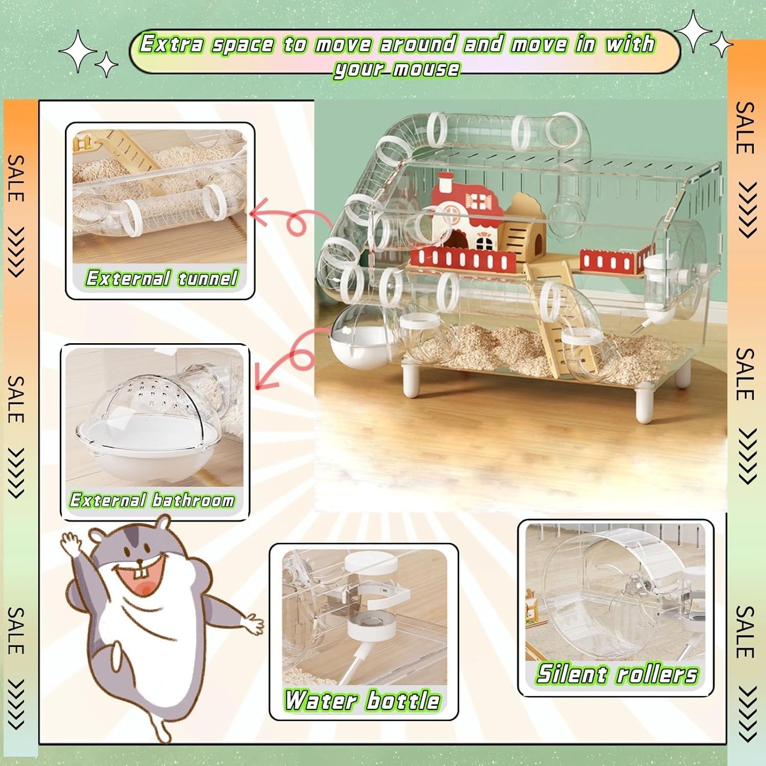 Multi-Storey Design with Extended Tubes 17.7″x11.8″x13″ hamster cage features interconnected tunnels for climbing and play. Ideal for dwarf hamsters, gerbils, or mice seeking adventure. Durable acrylic structure balances beauty and practicality, offering vertical space for small animal habitats.