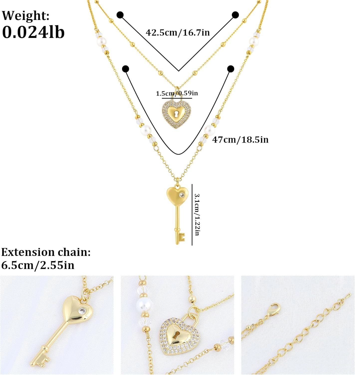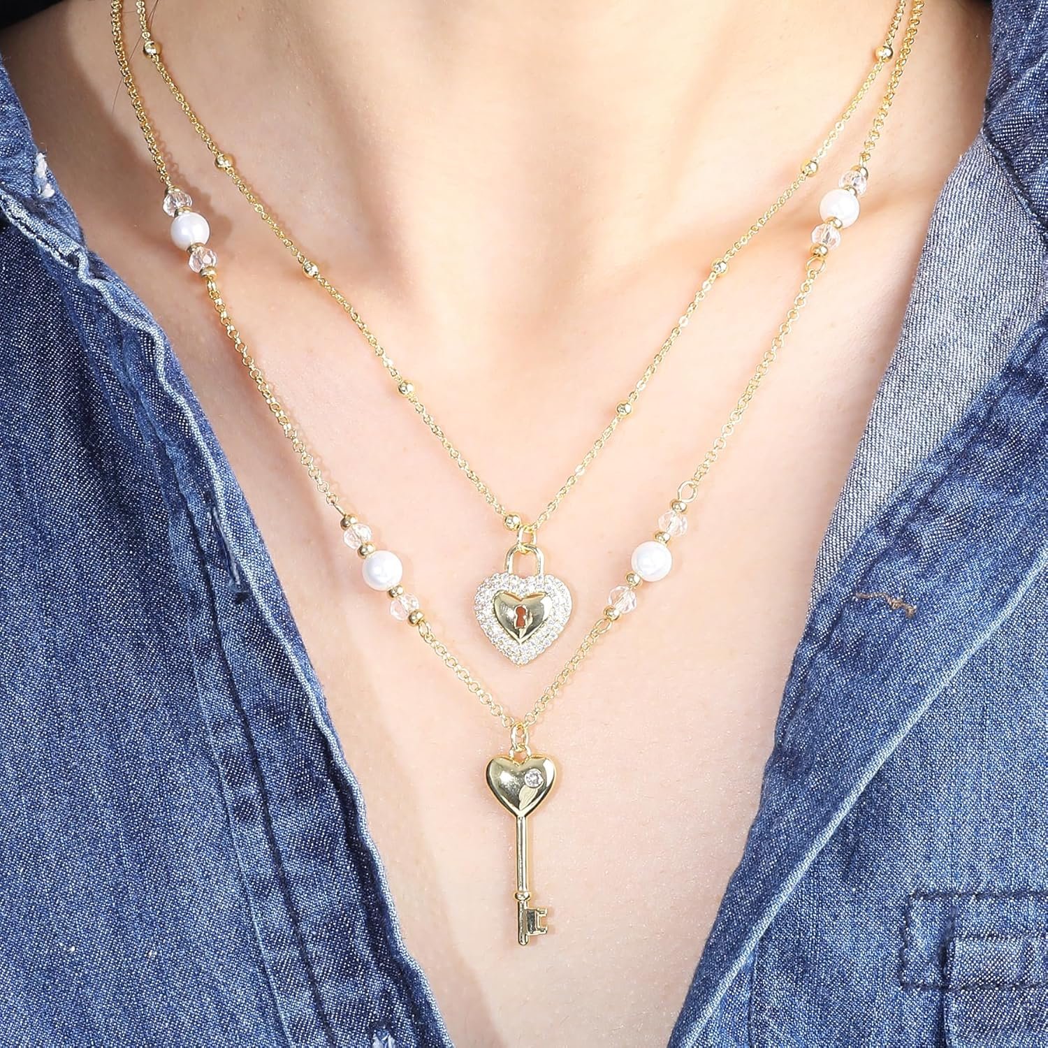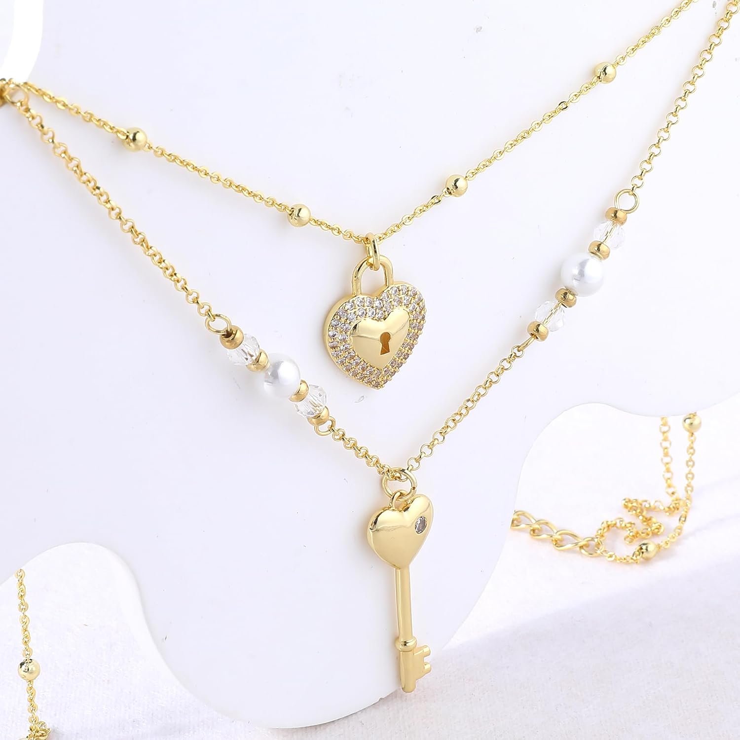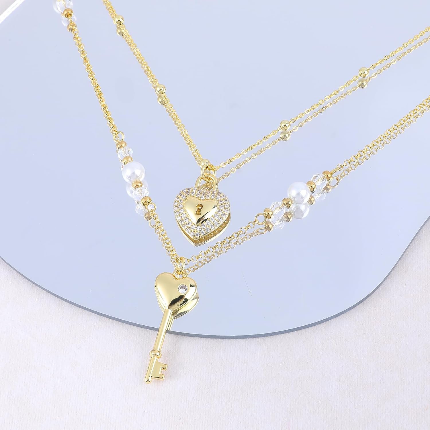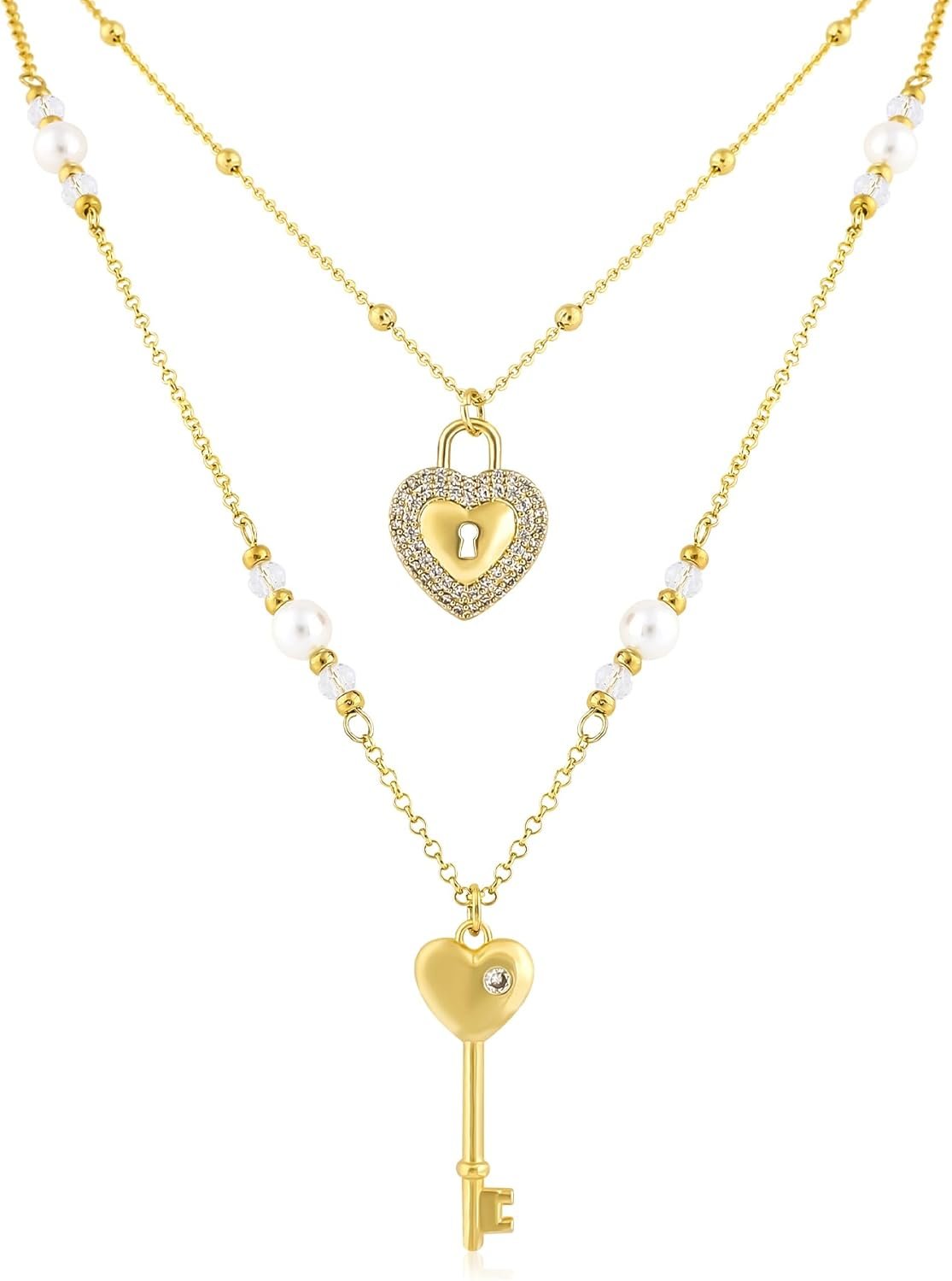 The shorter chain features a gold zircon heart lock pendant that sparkles brilliantly, symbolizing protection and cherished love.The longer chain is adorned with gold beads, white faux pearls, and transparent faceted glass beads, adding depth and a touch of glamour.It is paired with a gold heart key pendant, representing unlocking a bright future.