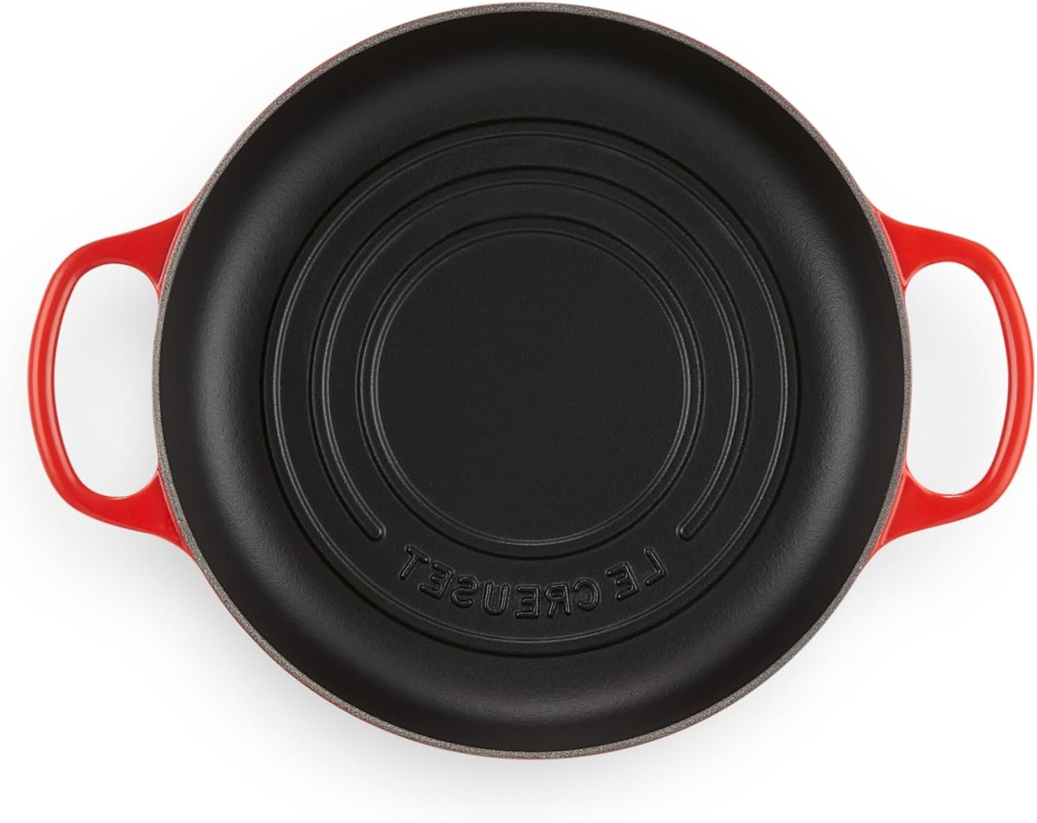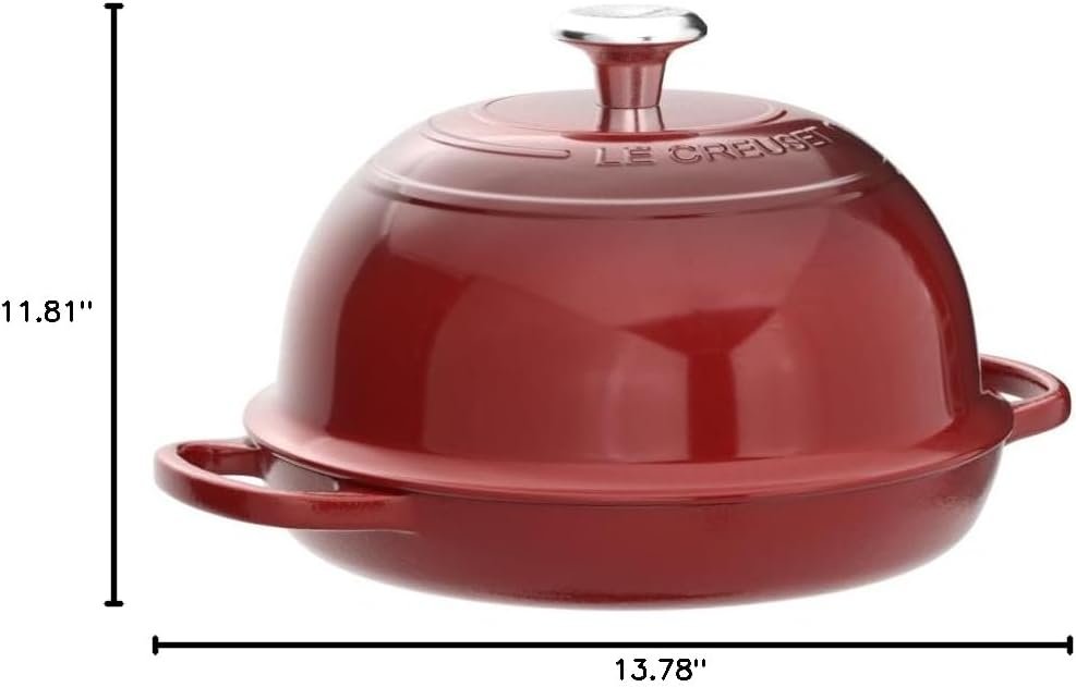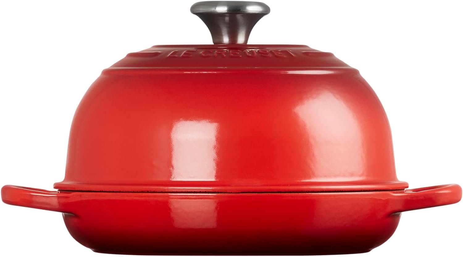 Low-profile base has raised ridges for even browning and marks the loaf with the Le Creuset three rings
