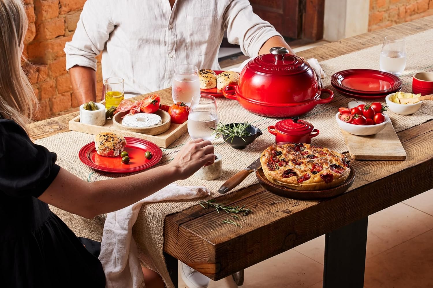 The Le Creuset Bread Oven takes home baking to the next level of delicious and beautiful. Crafted from our legendary cast iron for superior heat distribution, this purpose-built shape with its domed lid traps and circulates steam to create bakery-quality results. The matte black interior enamel is easy to clean, while the low-profile base promotes even browning and produces a golden, crispy crust marked with our hallmark three rings.
