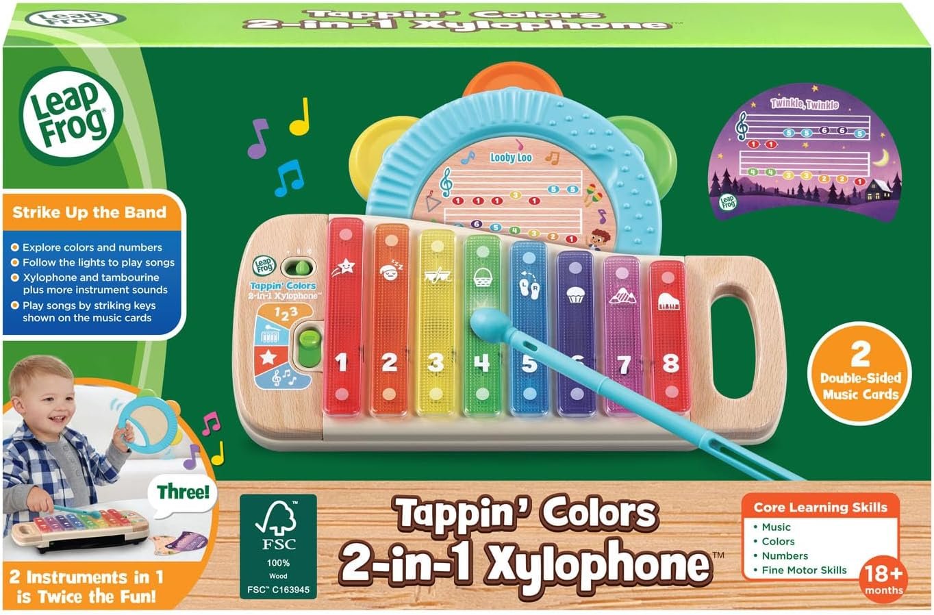 Get two instruments in one with the Tappin’ Colors 2-in-1 Xylophone! Bring learning to musical exploration with four interactive ways to play. Help kids build confidence as they follow the lights to learn how to play eight well-known tunes. Hear first words about numbers and colors, or play notes to hear xylophone, glockenspiel and strings sounds. Jam along to nine original tunes! Hand the removable tambourine to a friend, then tap the xylophone with the mallet and play together. Two double-sided music cards and eight light-up keys make it a snap to tap out a tune. Tuck the music card into the tambourine, and the tambourine into the xylophone, for a handy-dandy music stand. This product is made with 100% FSC-certified wood that comes from well-managed forests. Find more downloadable sheet music at leapfrog.com/xylophone. Intended for ages 18+ months. Requires 2 AA batteries. Batteries included for demo purposes only. New batteries recommended for regular use.