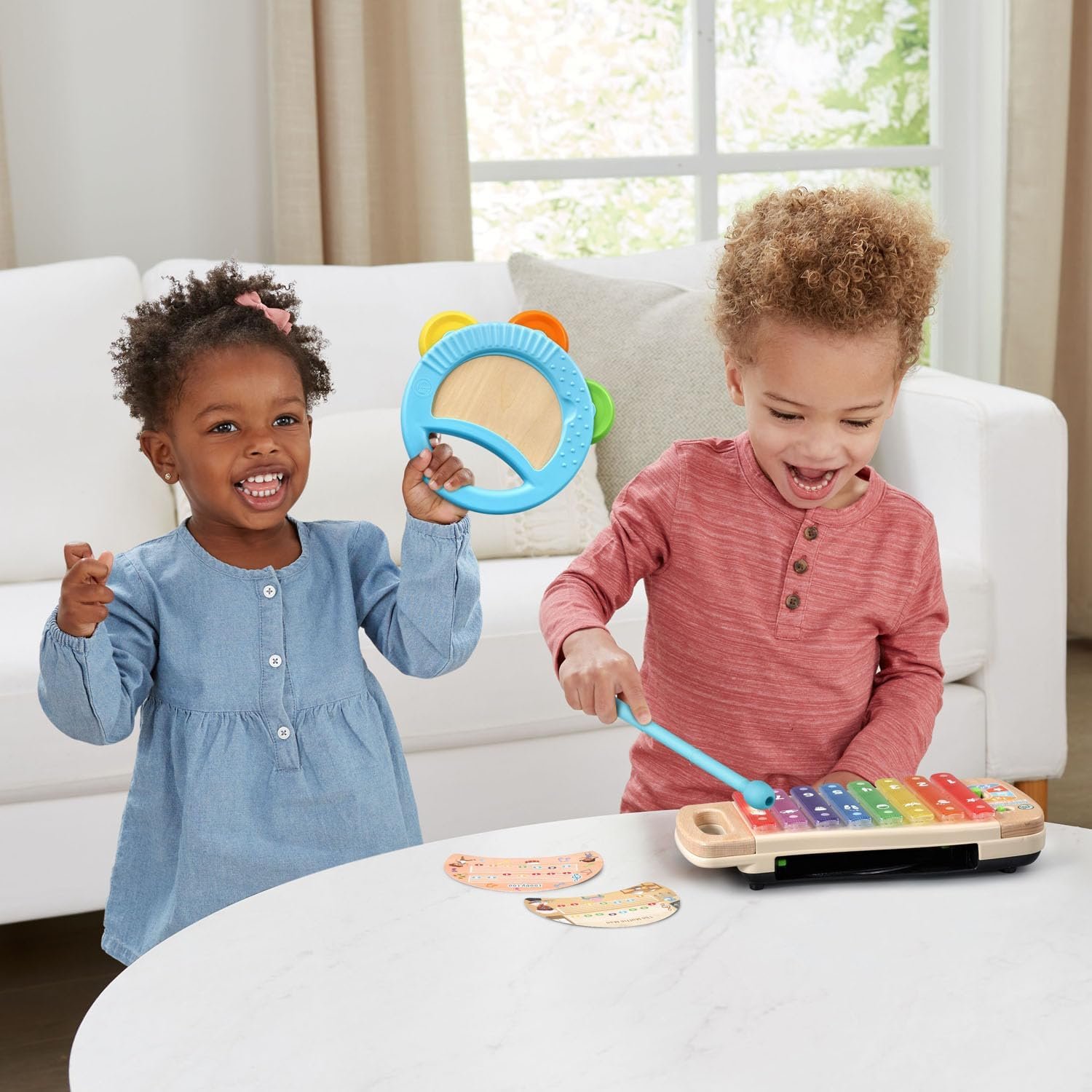 Explore two-in-one musical play with the interactive xylophone and tambourine; strike the keys with the included mallet