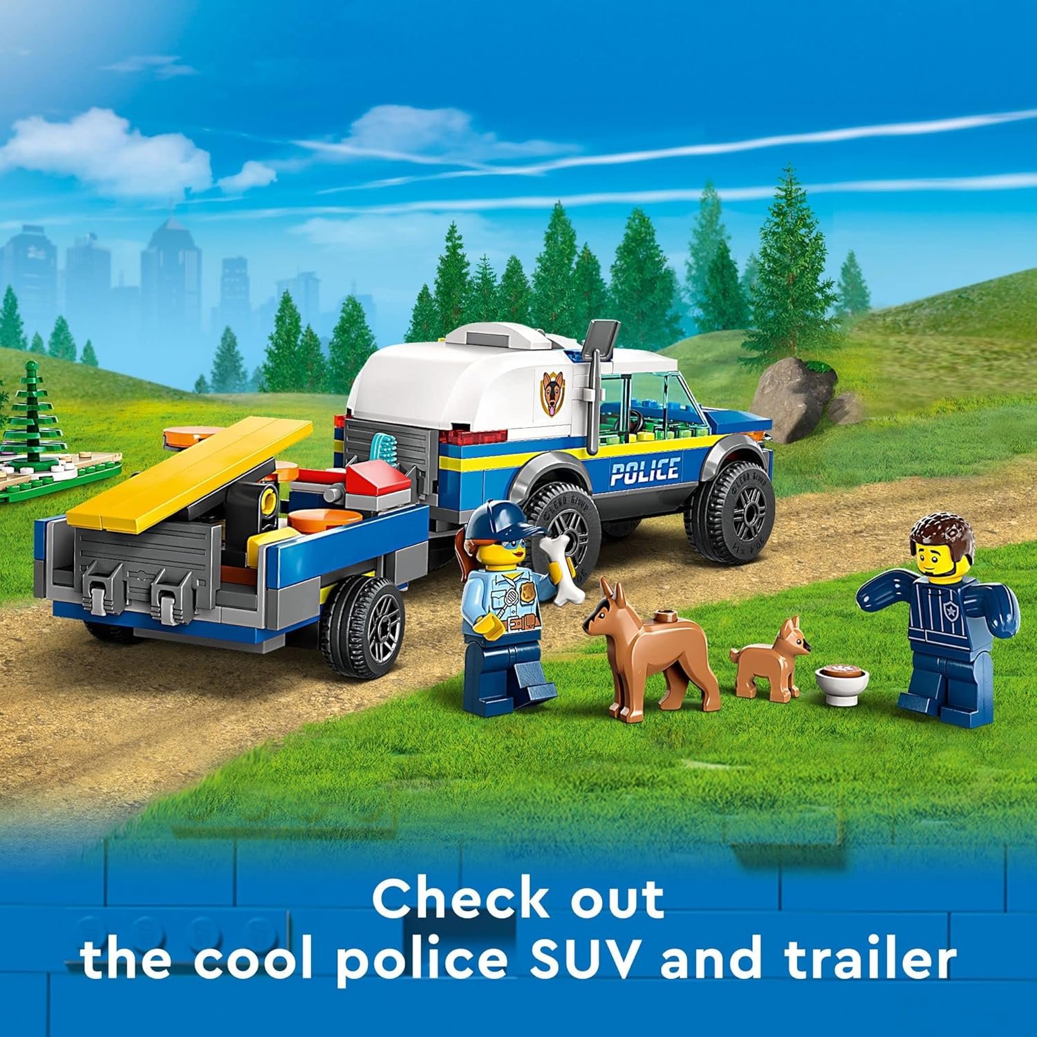 This LEGO City police toy set features an SUV police car toy with trailer, a dog and puppy figure plus 3 activities to role-play a puppy training day