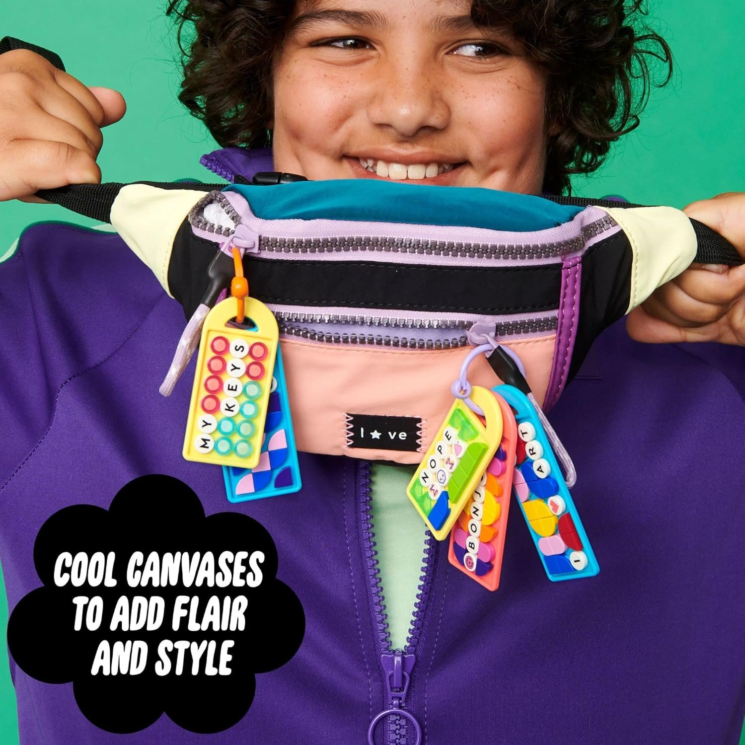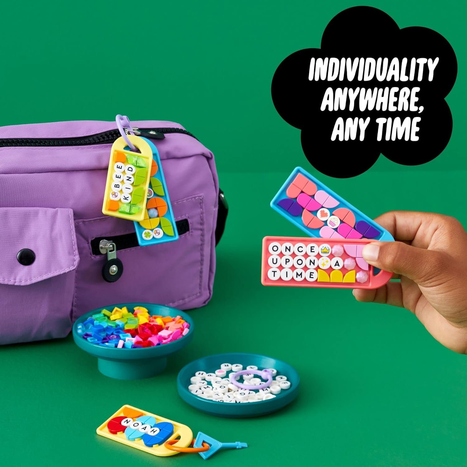 Colorful messages everywhere – Kids can expand their creativity as they design with the kit, which includes 5 flat bag tags in different colors and 2 sizes, plus lots of lettered and colored tiles