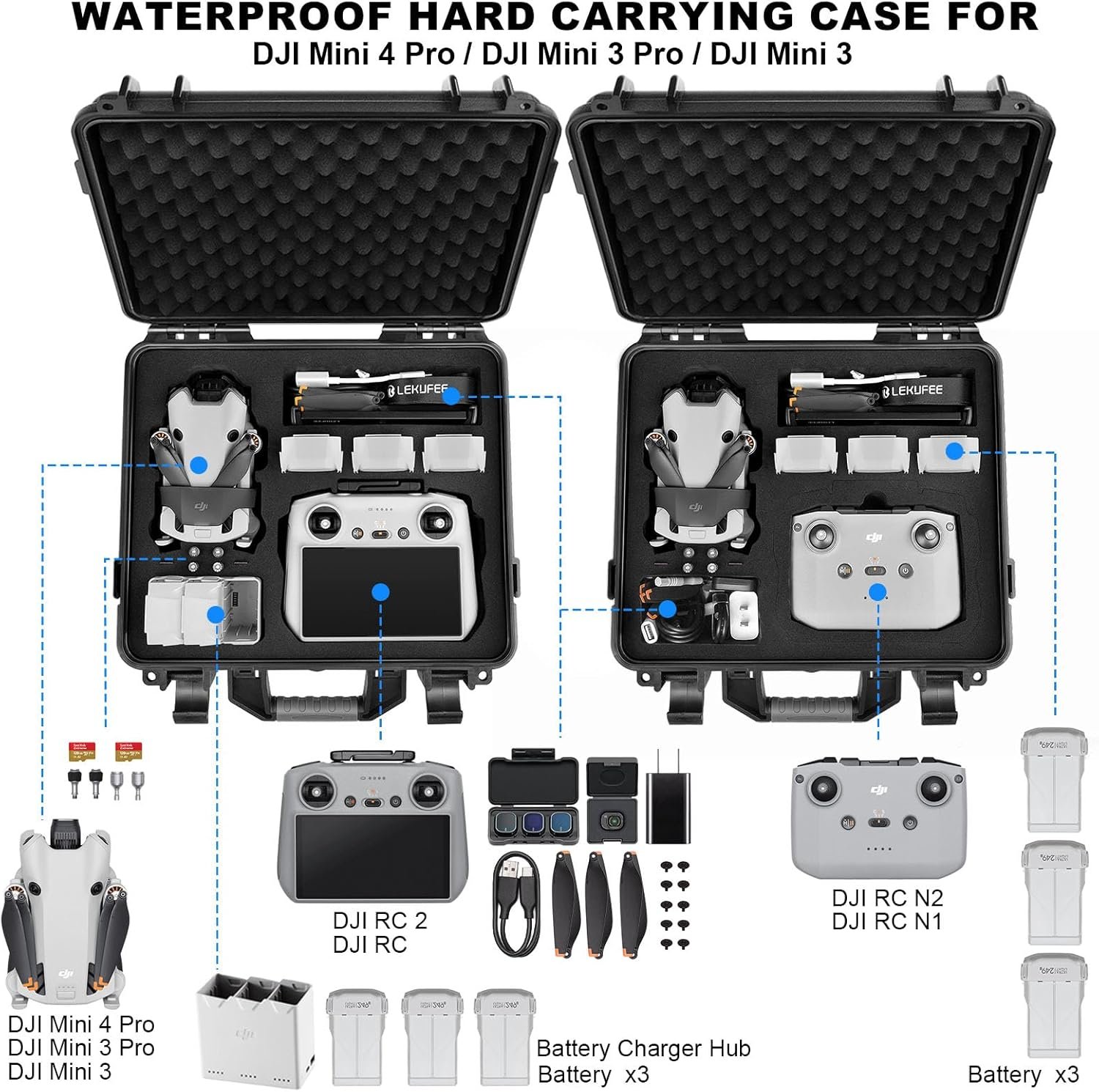 Custom Design: This New Lekufee waterproof carrying case comes with custom EVA foam and shoulder strap. Designed for dji mini 4 pro drone,dji mini 3 Pro,dji mini 3,fly more combo and more accessories.