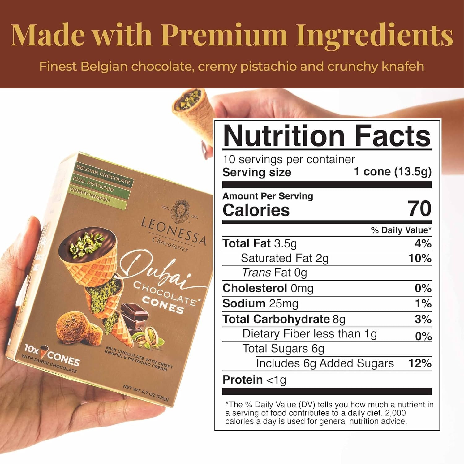 Authentic Belgian Chocolate: Crafted with rich, smooth Belgian chocolate for a decadent treat. These Dubai chocolate cones are perfect for gifting or indulging in yourself—experience the taste of luxury with every bite.